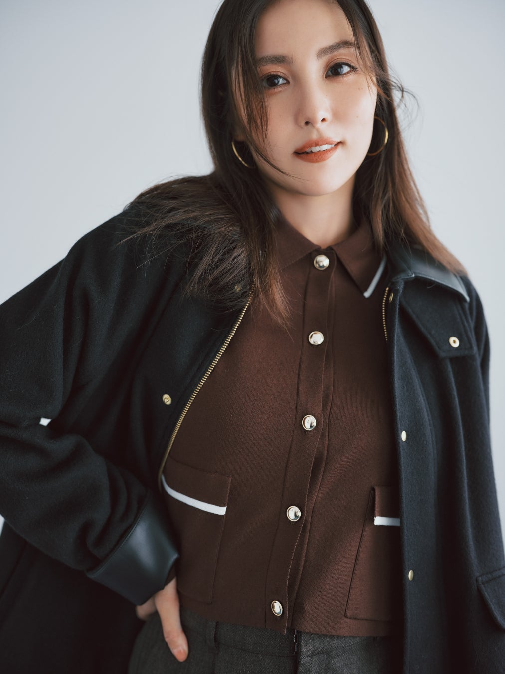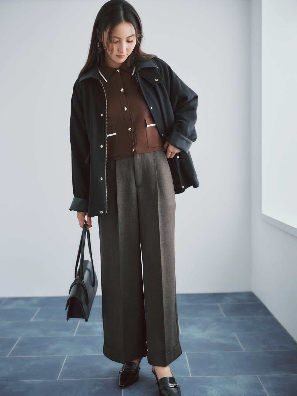 「上質なアウターを主役に、秋冬はちょっぴりトラッドな着こなしも気分。このアウターはカシミヤ混というだけあって、膨らみのある柔らかな風合いで高級感たっぷり。ボトムはいつもならデニムが定番だけど、軽くてキレイ見えするセミワイドパンツを合わせたモダンなムードにも惹かれています」