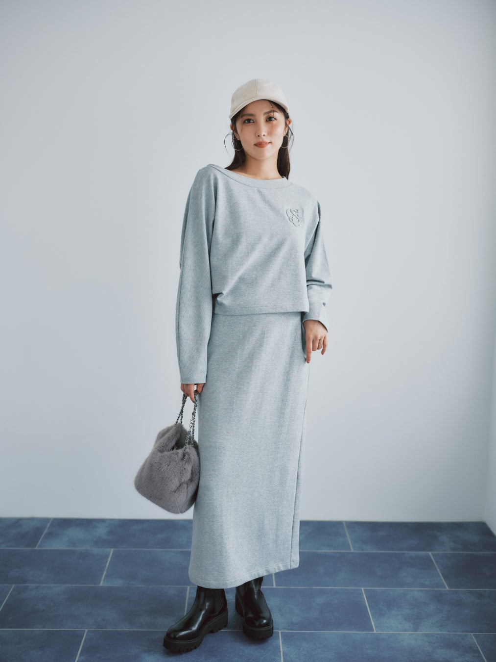 「クローゼットに欠かせない、スウェット&セットアップは毎年更新。コーディネートを考えられないときも、これさえあれば安心な頼れるセットアップ。さり気ないラメも秋冬ムードを高めてくれます。エンボスロゴがポイントのトップスは、デニムにサラッと合わせるだけでも可愛い」