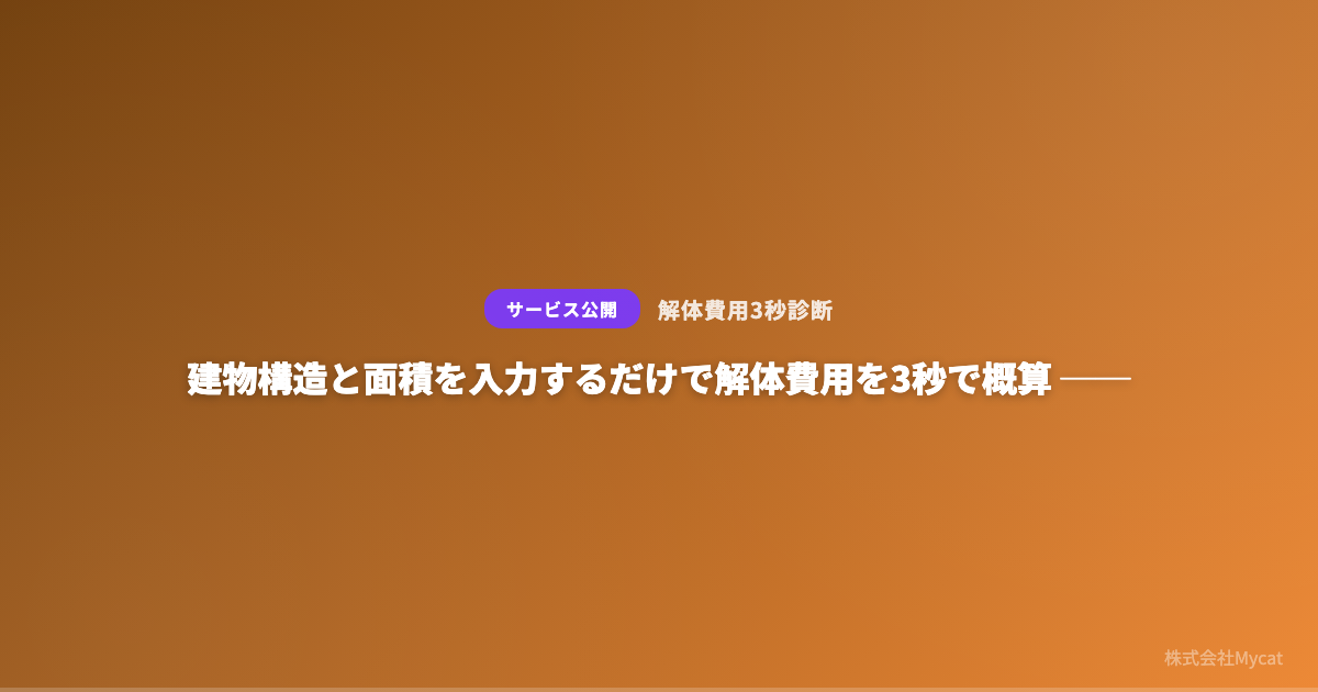 株式会社Mycat(本社:東京都目黒区)は、建物の構造と面積を入力するだけで解体費用の概算を3秒で算出するWebサービス「解体費用3秒診断」(https://kaitai.xyz)を公開した。