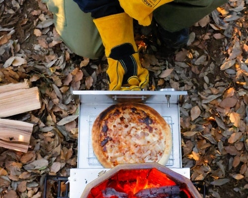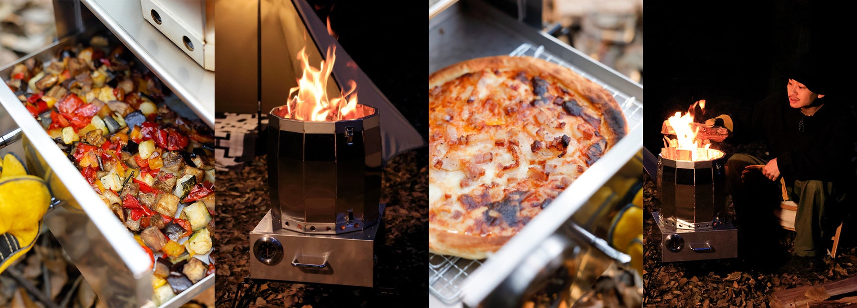 オーブンを下に設置することで上部の焚き火を楽しみながら調理ができる優れもの。焚き火台の熱伝導でオーブンの温度が200℃以上と高温になります。上部のワイン樽のような形状を金物加工技術で実現させ、キャンプでの食事をより一層盛り立てます。