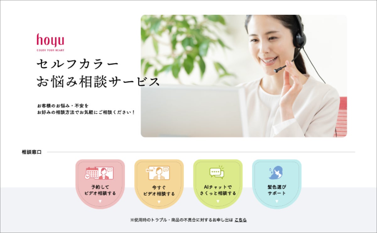 「hoyu セルフカラーお悩み相談サービス」は、お客様個々が抱えるセルフカラーにまつわる疑念/疑問から生じる『不安/不満』を払拭し、より手軽に、セルフカラーを楽しんでいただくためのオンラインカウンセリングサービスです。
