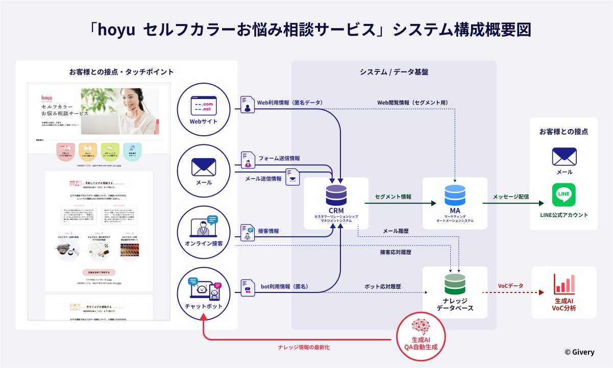 ギブリーは本サービスに関連して、当社が得意とする生成AI活用とマーケティングDX支援のノウハウを最大限に活用し、CX企画・設計からオンラインカウンセリングサービスのシステム提供、生成AI活用提案まで包括的なサポートを提供しています。