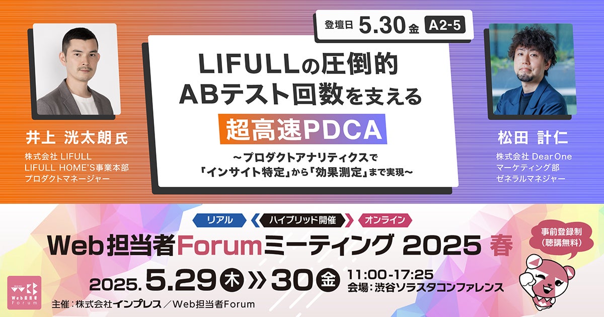 株式会社NTTドコモのマーケティング分野における新規事業型子会社である株式会社DearOne(本社:東京都港区、代表取締役:河野 恭久、以下:DearOne)は、2025年5月29日 (木)、30日(金)に開催されるイベント「Web担当者Forum ミーティング2025 春」に登壇します。株式会社LIFULLのLIFULL HOME’S事業本部プロダクトマネージャー井上 洸太朗氏をお迎えし、プロダクトアナリティクスによってどのようにPDCAを回しているのか。課題発見から成果創出に至るまでを深掘りしてお話いたします。
