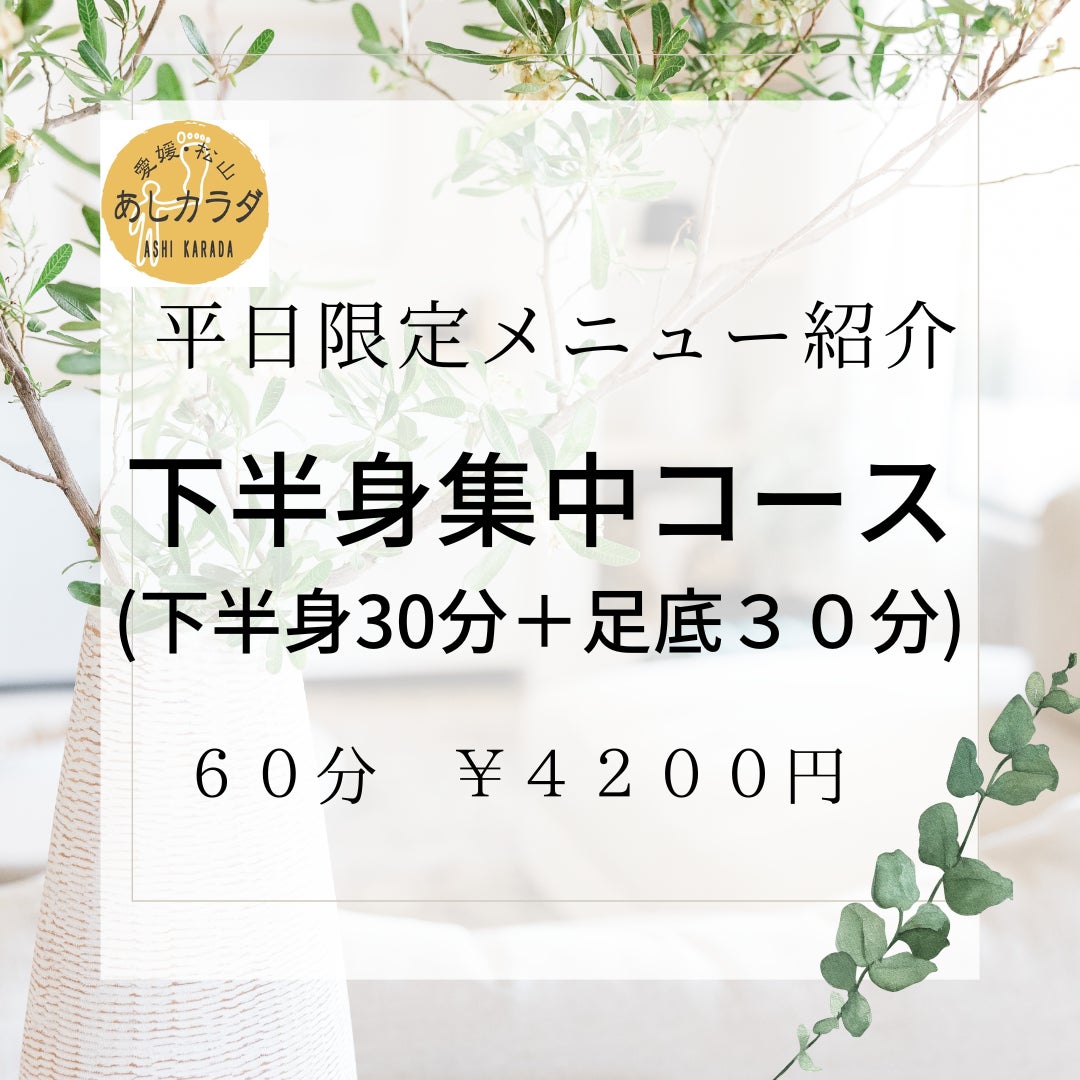 【下半身集中コース】は、腰~足にかけてのもみほぐし施術30分と足裏の施術30分を掛け合わせたコースメニューとなっております。