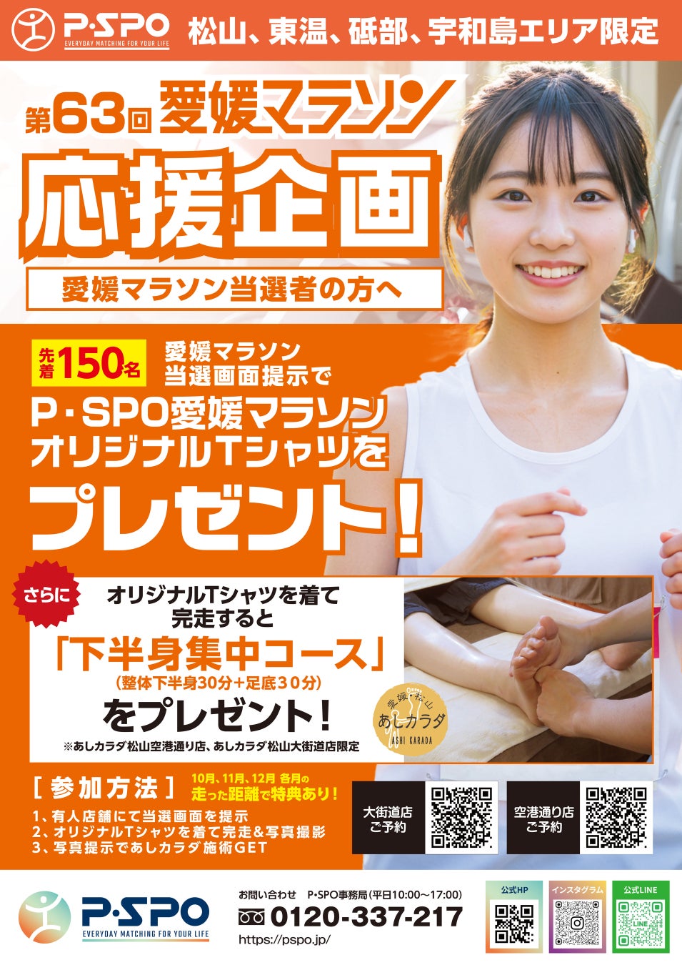 P-SPOオリジナルTシャツを着用して愛媛マラソンを完走・写真撮影をされた方にあしカラダの人気メニュー「下半身集中コース」無料施術特典をプレゼント! ※撮影した写真を提示でGET