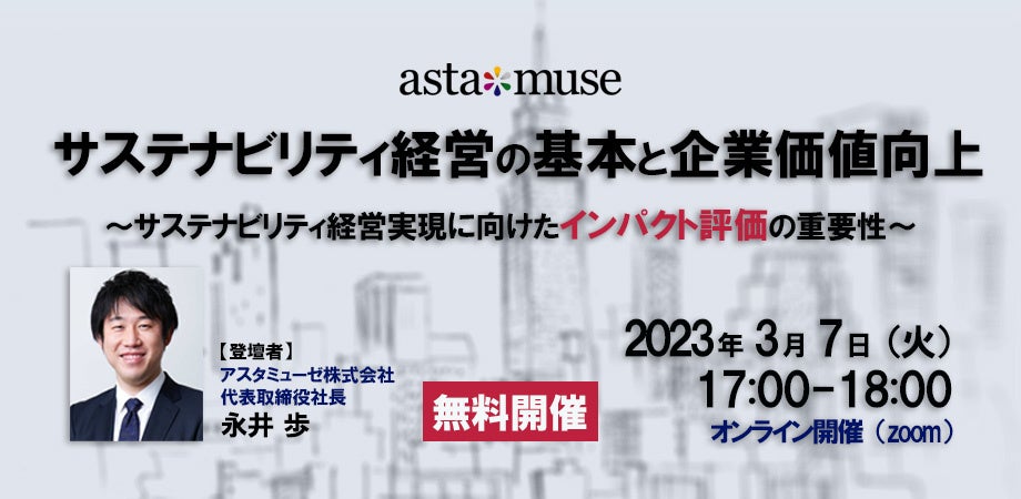 アスタミューゼ株式会社(本社:東京都千代田区、代表取締役社長 永井歩)は、2023年3月7日(火)17:00-18:00に、サステナビリティに関する課題をお持ちの経営者、経営企画、IRや広報担当者向けの無料ウェビナー「サステナビリティ経営の基本と企業価値向上~サステナビリティ経営実現において最初にやるべき事~」を開催いたします。昨年5月17日に開催し、ご好評いただいたウェビナーの内容を一部アップデートしての再講演となります。