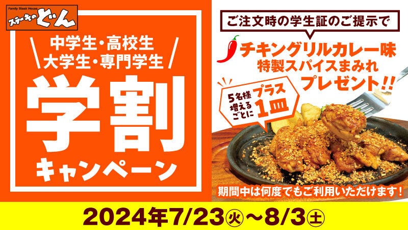 株式会社アークミール(本社:埼玉県さいたま市、代表取締役社長:柳 先)が運営する「ステーキのどん」は、学生の皆様に今年の夏休みを思いっきり楽しんでいただけるように、2024年7月22日(火)より全国62店舗で「学割キャンペーン“チキングリルカレー味”プレゼント」を実施します。
