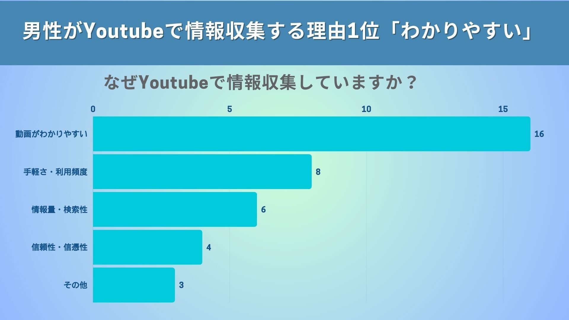 動画がわかりやすいという点が最も多い理由として挙げられており、男性にとって視覚的な情報と具体的な実践方法が一目で理解できることが重要であることがわかります。次に多い理由は手軽さ・利用頻度であり、YouTubeが日常的に使いやすく、信頼性のある情報を短時間で入手できる点が評価されています。また、信頼性・信憑性や情報量・検索性も重要な要因として挙げられており、男性は信頼できる情報を効率的に検索して得ることを重視していることがわかります。