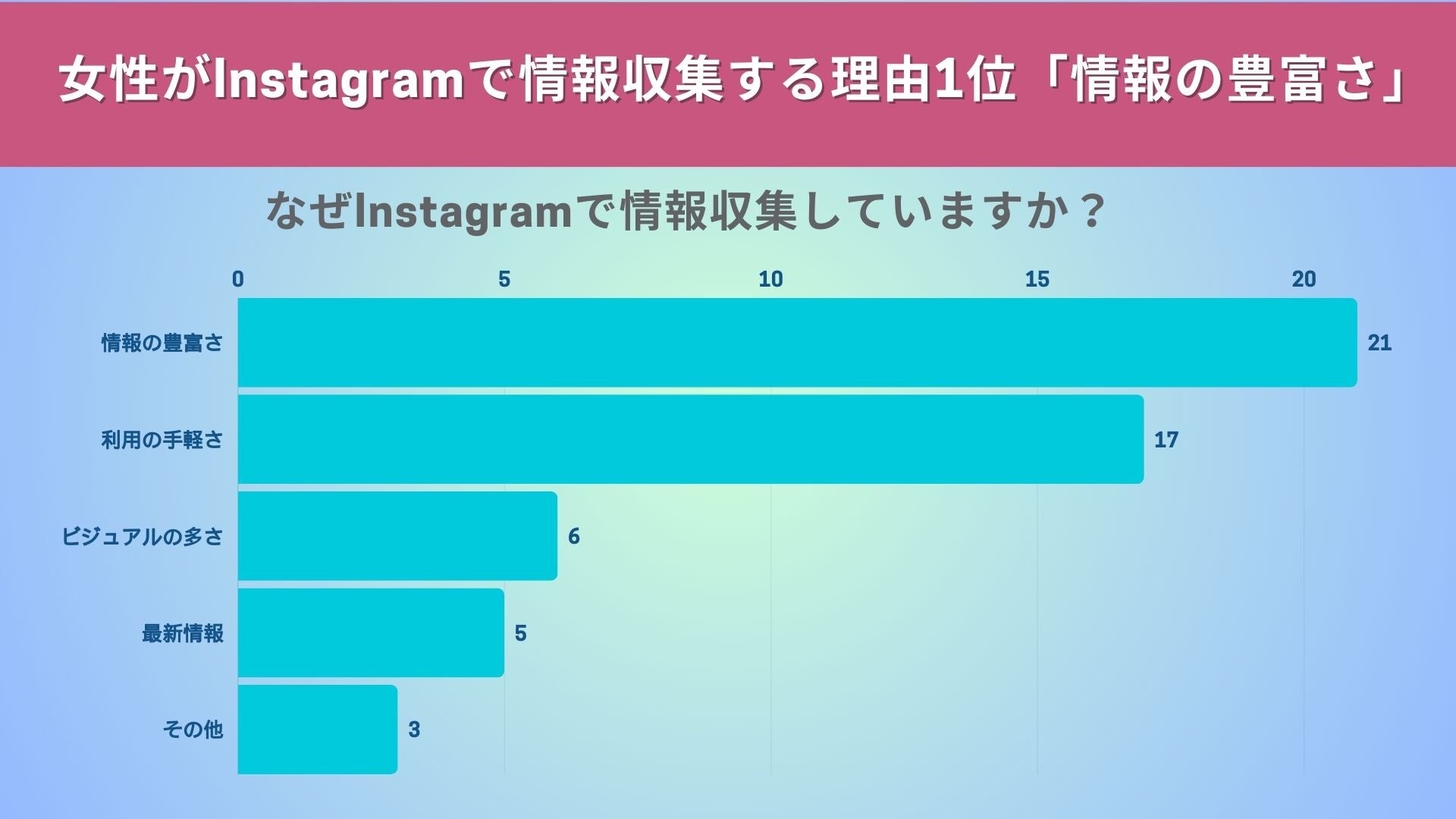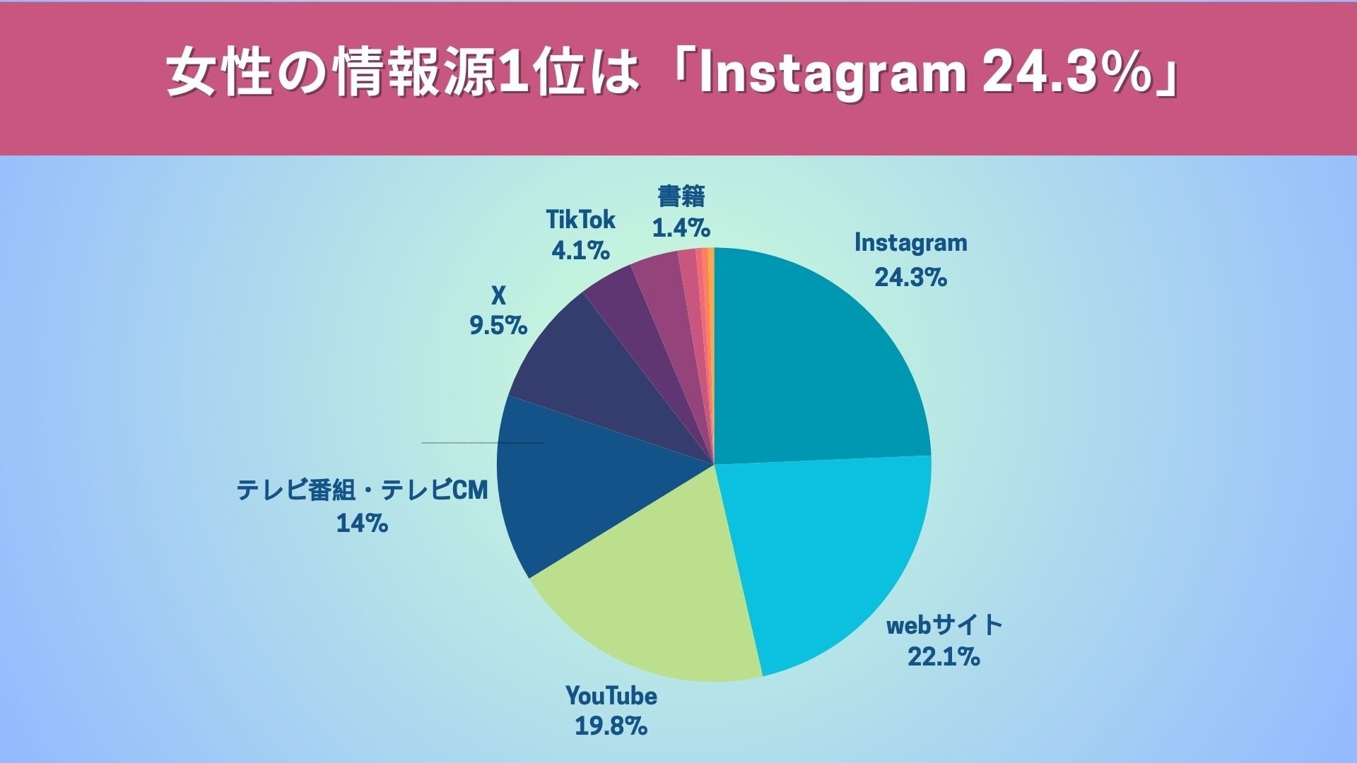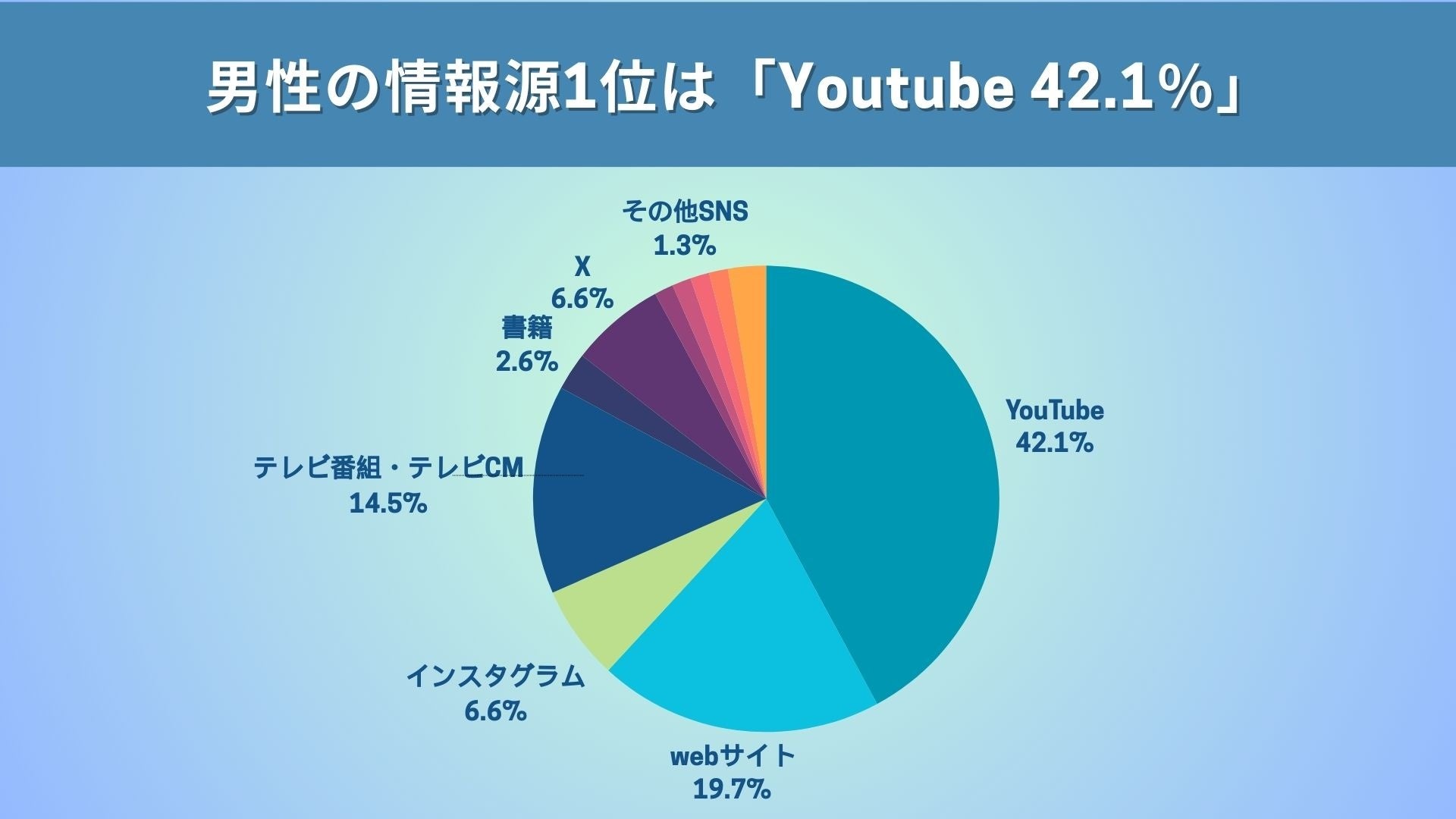 男性は主にYouTubeやウェブサイトから情報を得ていることが多く、Instagramの利用は女性ほど頻繁ではないように見受けられます。