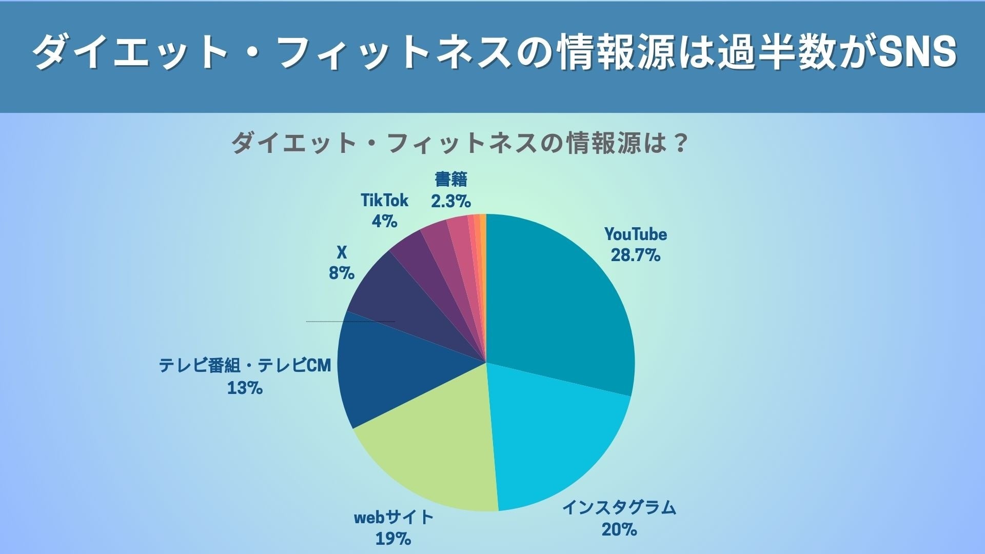 ダイエット・フィットネスの情報源はYoutubeをはじめとしたSNSが過半数を占めています。現代社会では、SNSが主要な情報源として利用されていることがダイエットやフィットネスの情報収集においても表れています。