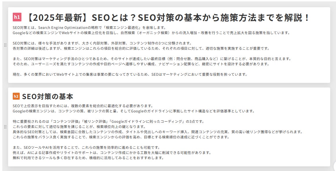 「簡単SEO記事作成」機能では、検索上位のページ情報を参考にSEOで上位化するために必要な要素を自動で抽出し、記事の見出しから本文までをAIが全て自動で作成します。