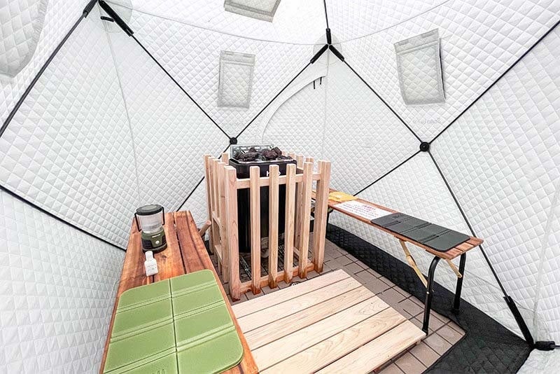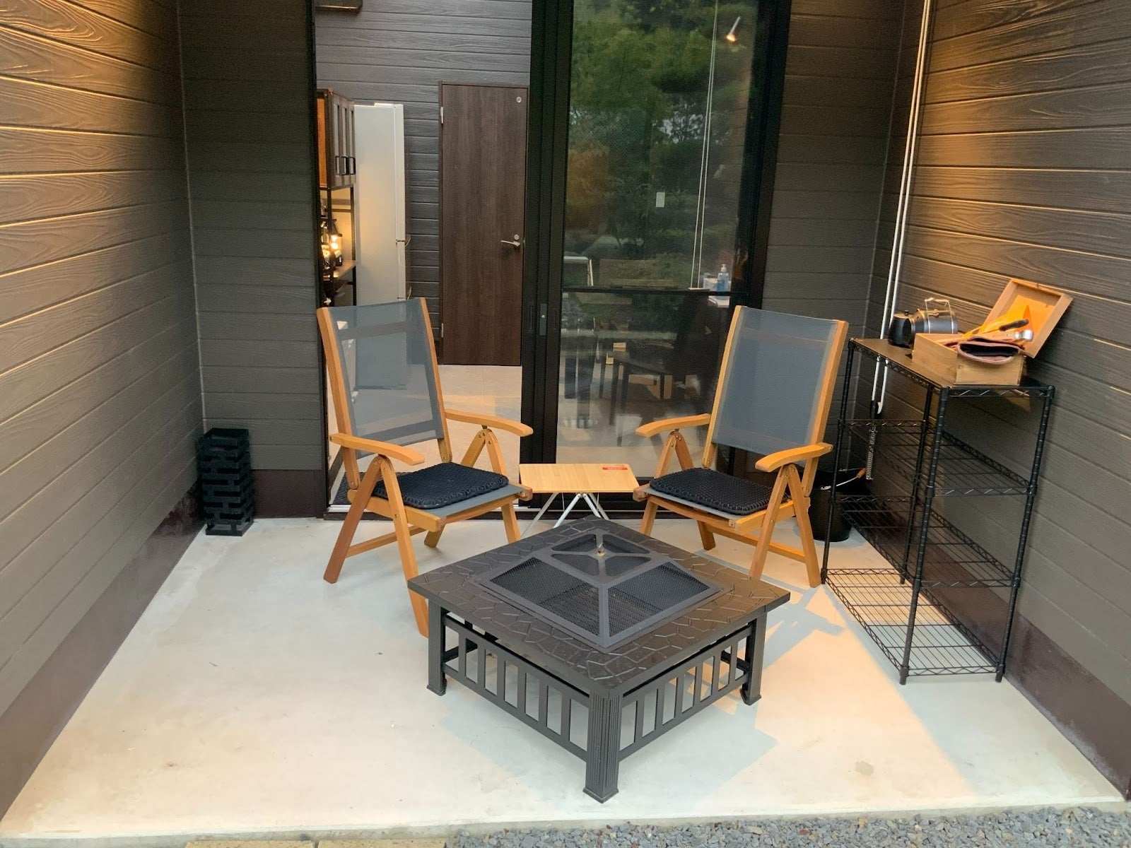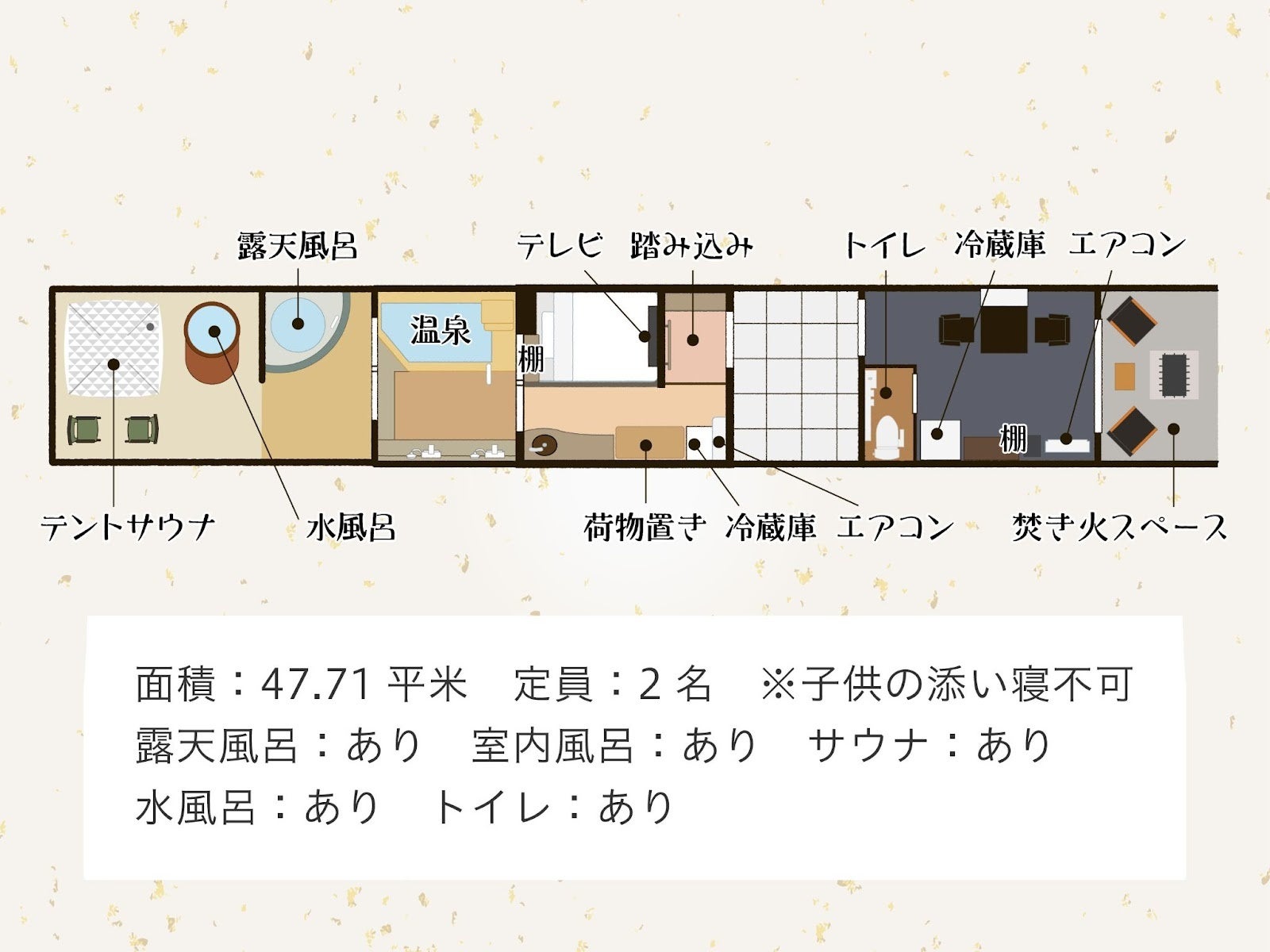 室内設備:露天風呂、内風呂、水風呂、テントサウナ、ダイニング、トイレ、専用焚き火スペース