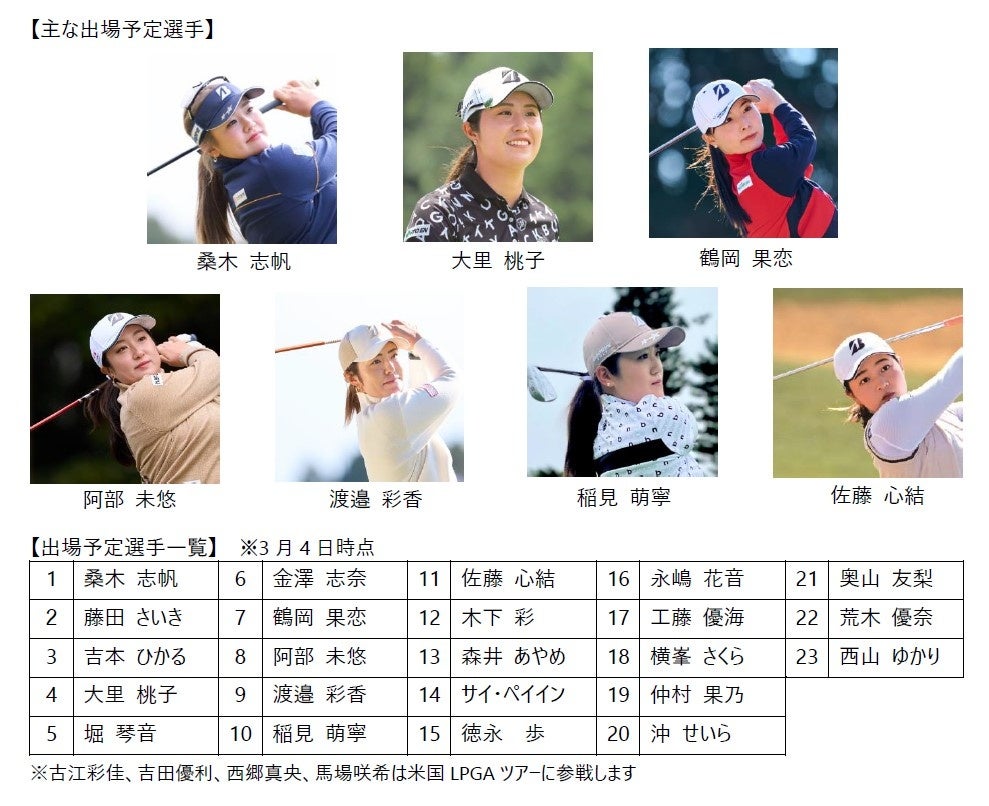 3月6日から行われる国内女子ツアー「第38回ダイキンオーキッドレディスゴルフトーナメント」には、昨シーズン初優勝からの3勝を挙げた桑木志帆をはじめ、同じく初優勝を挙げた阿部未悠や佐藤心結、年間を通じて上位の成績を収めた吉本ひかる、大里桃子、昨年自身初のシード権を獲得した鶴岡果恋が参戦します。また、今季から新たにチームブリヂストンに加わった、荒木優奈が出場しツアーを盛り上げます。