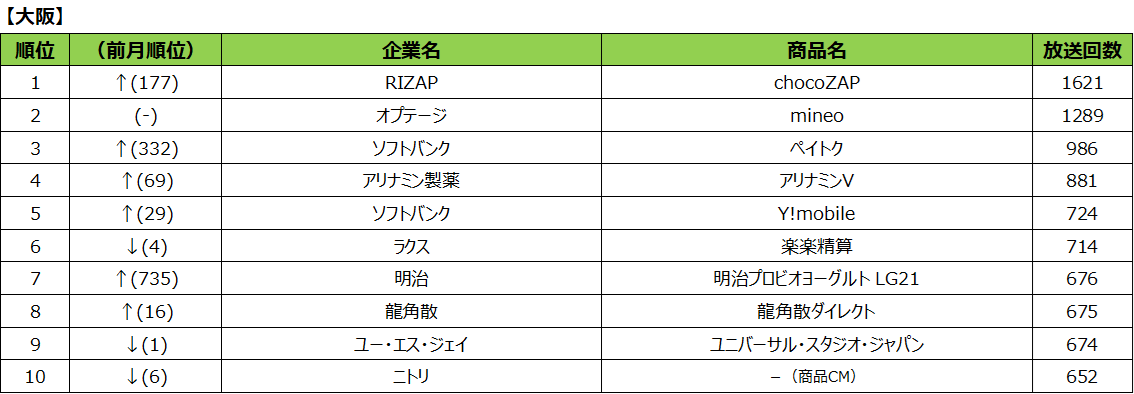 東京地区2位のOWNDAYS「オンデーズ」の新CMは、全体の約98%が東京地区での出稿でした。大阪地区で初登場2位、札幌地区で初登場3位となったオプテージ「mineo(マイネオ)」は、オプテージがMVNO(*4)として提供している携帯電話・データ通信サービスです。回線・データ容量・通話などそれぞれに多様なオプションを用意しており、ユーザー満足度が高いサービスとなっています。