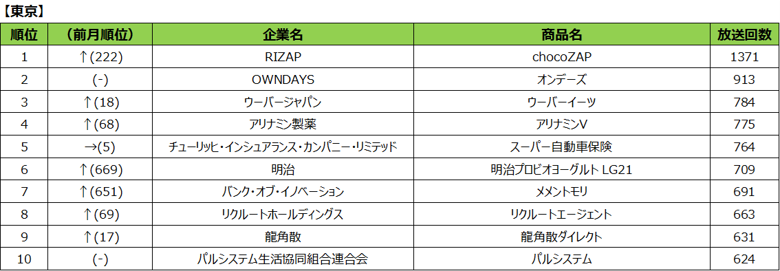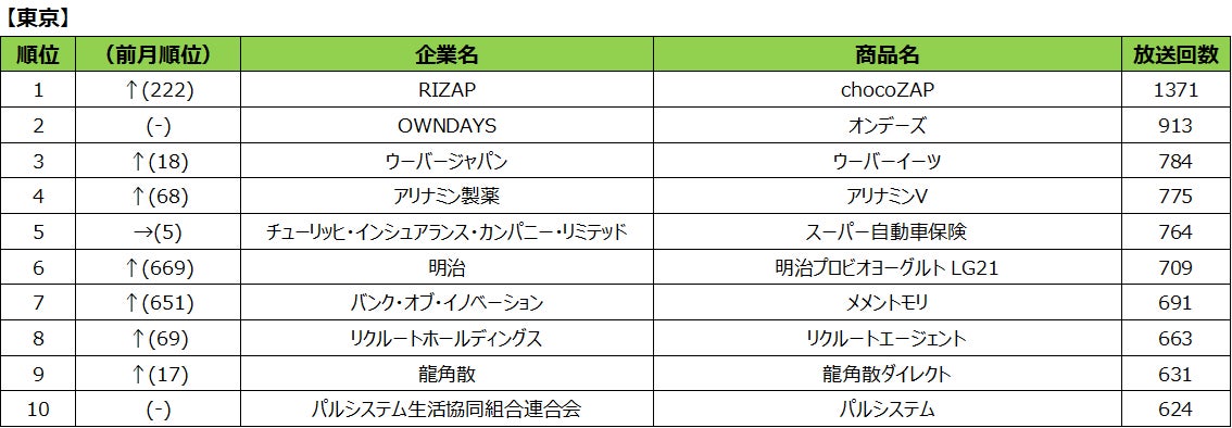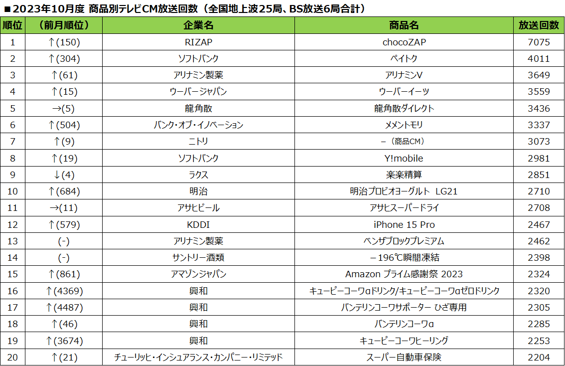 2023年10月度テレビCM放送回数ランキング発表~全国展開を進めるコンビニジム「chocoZAP」の出稿が急増~