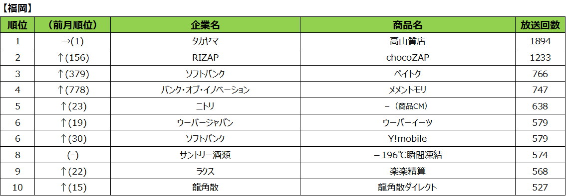 2023年10月度 エリア別テレビCM放送回数ランキング
