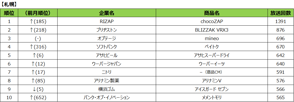 10月度商品別ランキングで1位となったRIZAP「chocoZAP」は、東京地区・大阪地区・名古屋地区・札幌地区で1位、福岡地区で2位にランクインしました。同CMが札幌地区のランキングに入るのは初めてであり、当該地区の店舗が順調に増えていると推測されます。