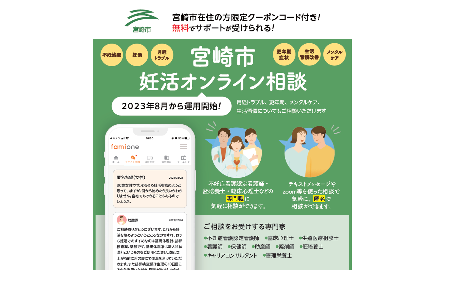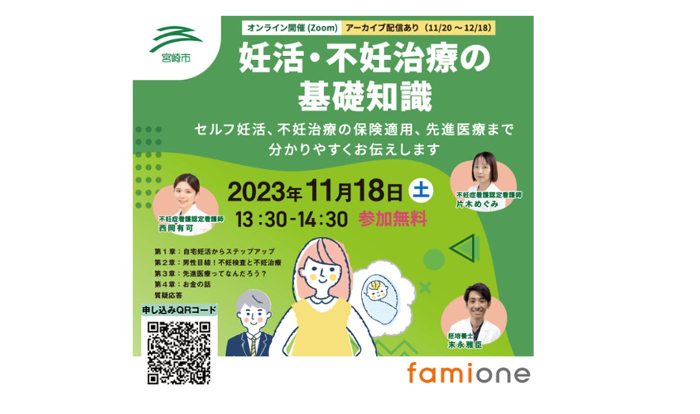 株式会社ファミワンは、宮崎県宮崎市からの委託を受け、『妊活サポート事業』として2023年8月からオンライン相談事業の提供を行っています。