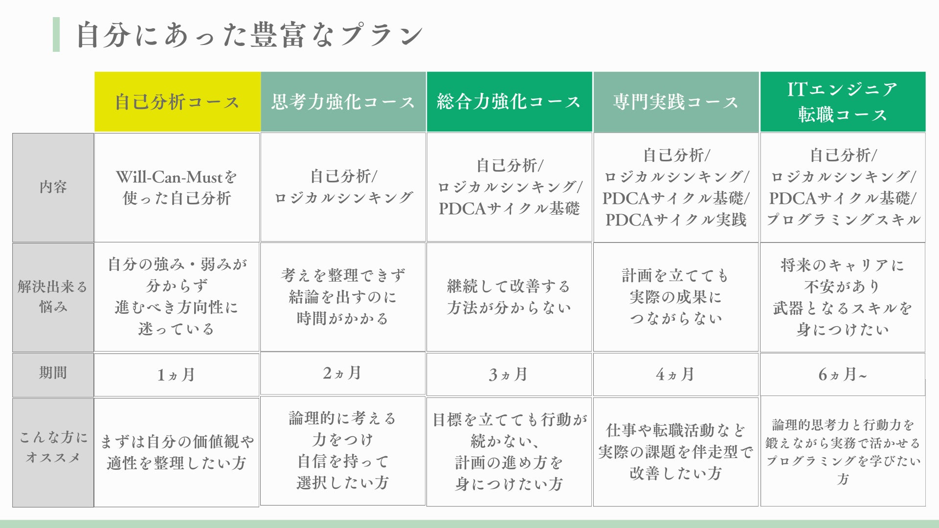 自身の強み・弱みを整理し、自身の現在時点を確認しキャリアの方向性を明確化することに特化したコースです。