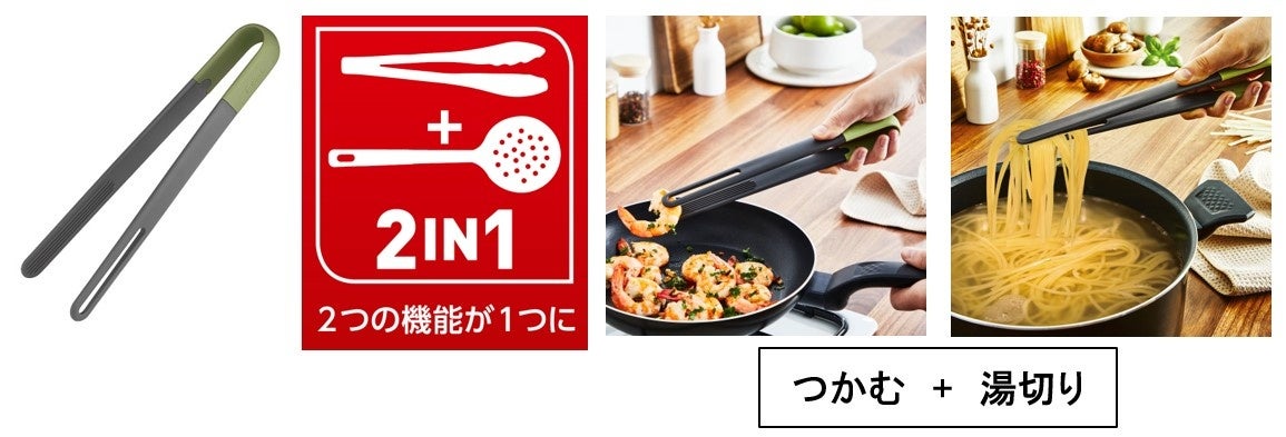 新発売の「エッセンシャル 2in1」は、2つの機能がひとつになった画期的なキッチンツールシリーズです。炒める、混ぜる、すくう、返す、つかむなど、調理方法や用途によって必要な機能が異なるキッチンツールは、数も種類も多くてかさばりがち。そこで、キッチンの限られた収納スペースには、ひとつで2役のキッチンツール「エッセンシャル2in1」がおすすめです。