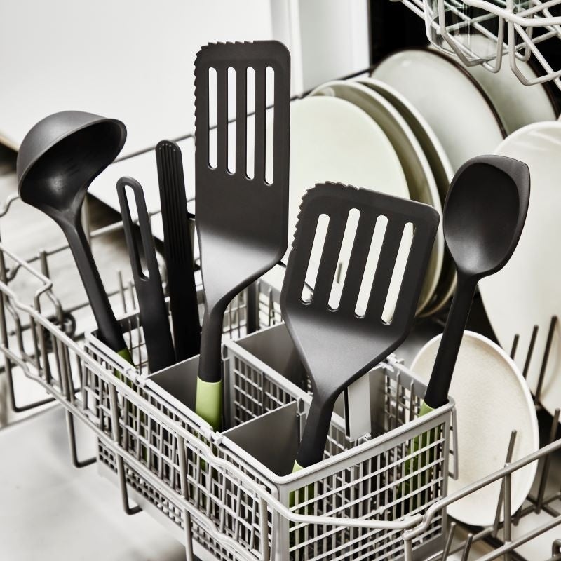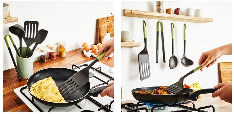 「エッセンシャル2in1」は全部で5アイテム。例えば、ターナーは「炒める」と「カット」の2役ができるようにデザインされていて、ヘラの片側のギザギザ部分で食材をカットできます。レードルは内側に目盛りがついて、調理中の「すくう」と「計る」が一度にできます。スプーンは「混ぜる」と「すくう」がひとつになり、ボウルの側面や鍋の隅まですくいやすい形状になっています。トングは食材をしっかり挟んで「つかむ」と「湯切り」の2役をこなします。さらに有害物質BPAを含まないので、安心してお使いいただけます。ひとつで複数の役割を果たす「エッセンシャル 2in1」は、料理をおいしく作れるのはもちろん、調理効率をアップして、洗い物も減らせるので、時短がかなうおすすめのキッチンツールです。