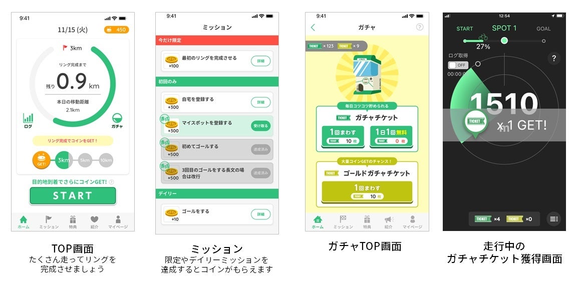 移動距離や設定した目的地へのゴール、毎日のミッション達成、移動中に手に入れられるチケットで回せるガチャなど、自転車移動で獲得できるコインを集めると、「楽天ポイント」と交換できます。なお、これまで提供してきたサイクルコンパスとしての機能も利用できます。