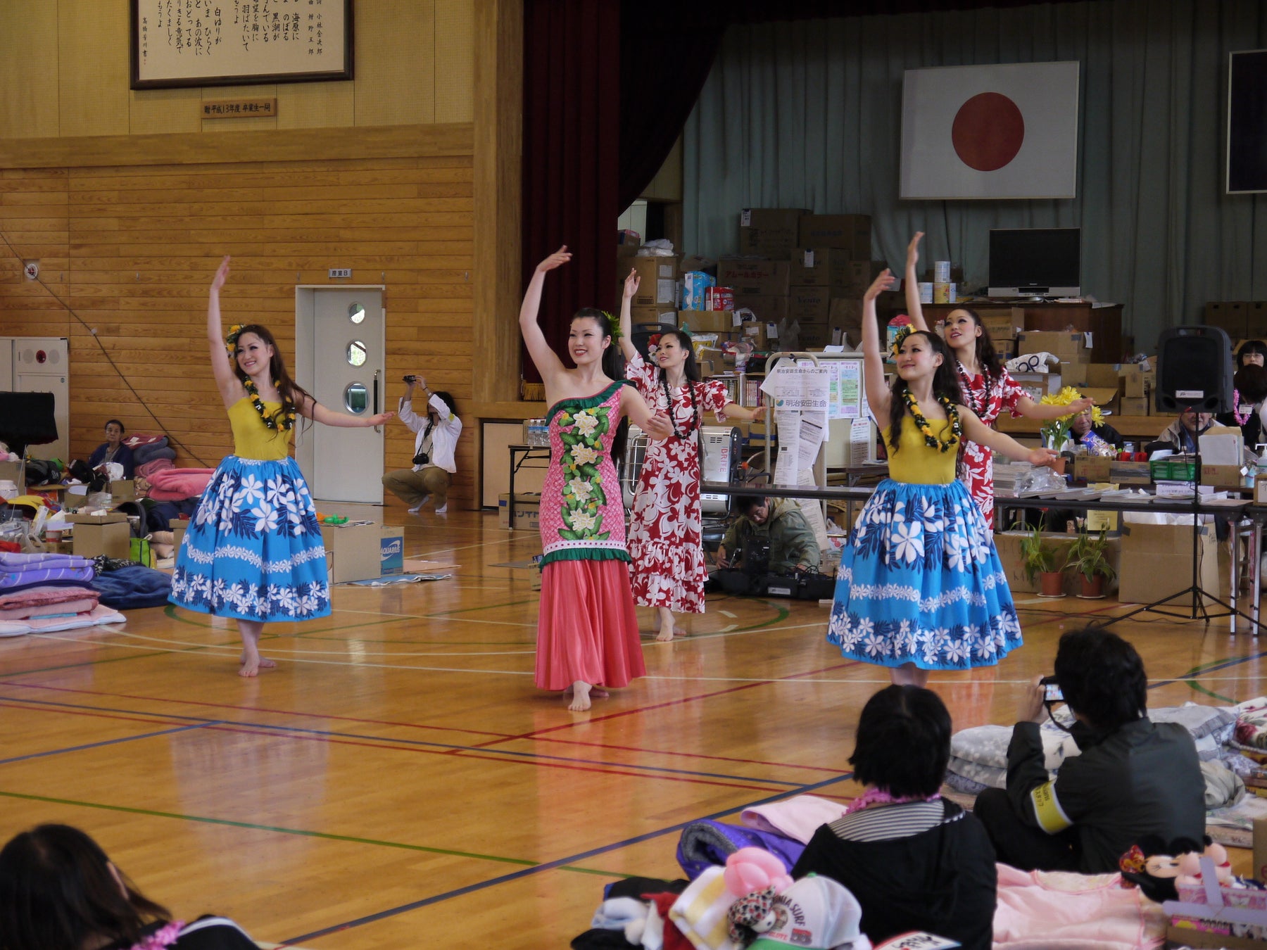 2011年3月11日に東日本大震災が発生。「スパリゾートハワイアンズ」は休館を余儀なくされ、フラガールたちは踊る場所を失ってしまいました。それでも原発事故の風評被害にあえぐ故郷いわき、福島、そして東北全体の復興のため少しでも役に立ちたい、福島・いわきの笑顔と元気を届けたいと、「フラガール全国きずなキャラバン」をスタートし、同年5月から10月までの間に、全国26都府県と韓国・ソウルを含む125か所で247回の公演を行いました。