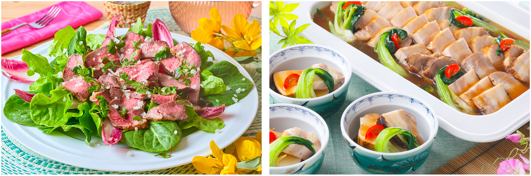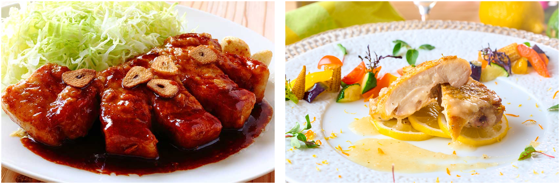 右:鶏肉料理はスペイン料理「チキンアドボ風ソテー~自家製アイオリソース~」をご用意しました。ワインビネガーで柔らかくなった鶏肉を香草の風味を付けて焼き上げた、さっぱりとした美味しさが楽しめる一品です。