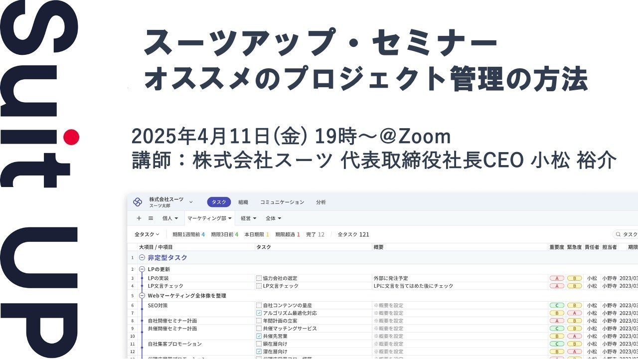 株式会社スーツ(所在地:東京都千代田区、代表取締役社長CEO:小松 裕介)は、2025年4月11日(金)19時から、当社代表の小松が講師を務めるスーツアップ・セミナー「オススメのプロジェクト管理の方法」を無料開催します!