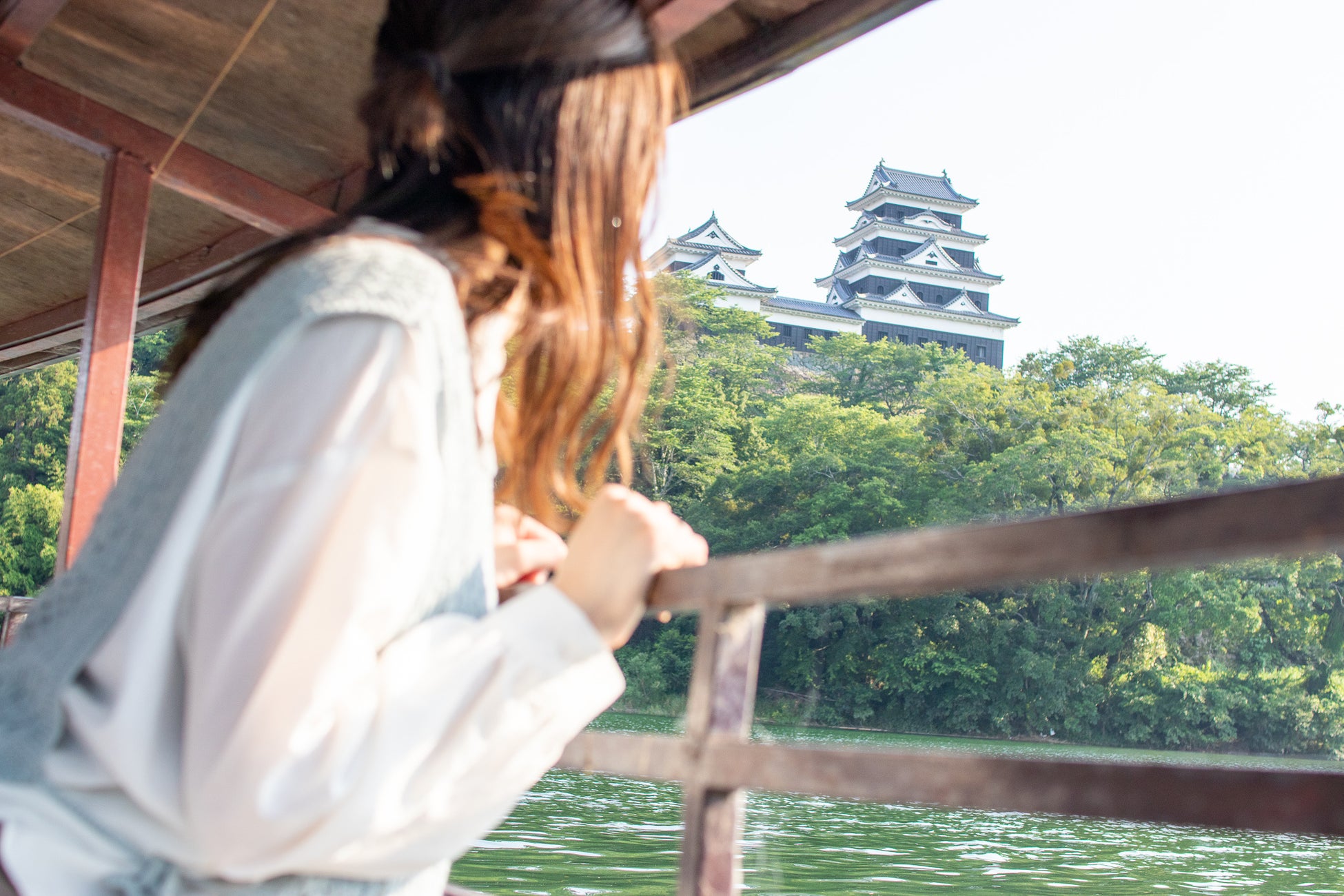 川舟からは大洲のシンボル、大洲城を間近に望みます。平成に入って木造で完全復元された大洲城と悠久の時を刻む肱川の流れは、城郭が整備されたといわれる江戸時代と変わらない景色です。