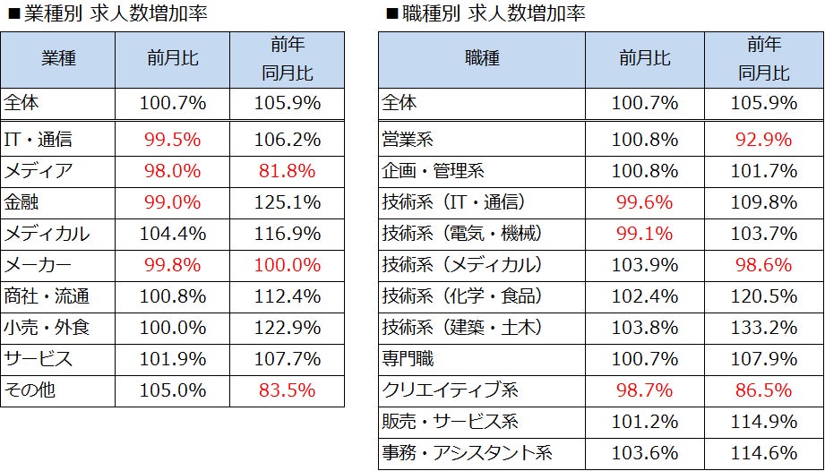 業種別では、「その他」以外の8業種のうち「メディカル」「商社・流通」「小売・外食」「サービス」の4業種で求人数が増加しました。求人の増加率が特に高かったのは、「メディカル」(前月比104.4%)、「サービス」(前月比101.9%)でした。職種別では、11職種のうち「技術系(IT・通信)」「技術系(電気・機械)」「 クリエイティブ系」を除く8職種で求人数が増加しました。求人の増加率が特に高かったのは、「技術系(メディカル)」(前月比103.9%)、「技術系(建築・土木) 」(前月比103.8%)でした。