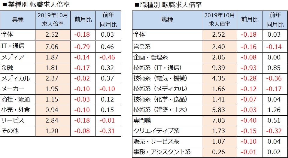 2019年10月の転職求人倍率は、前月比-0.18ポイントの2.52倍となりました。求人数は前月比100.7%、前年同月比105.9%となりました。転職希望者数は前月比107.7%、前年同月比104.6%でした。
