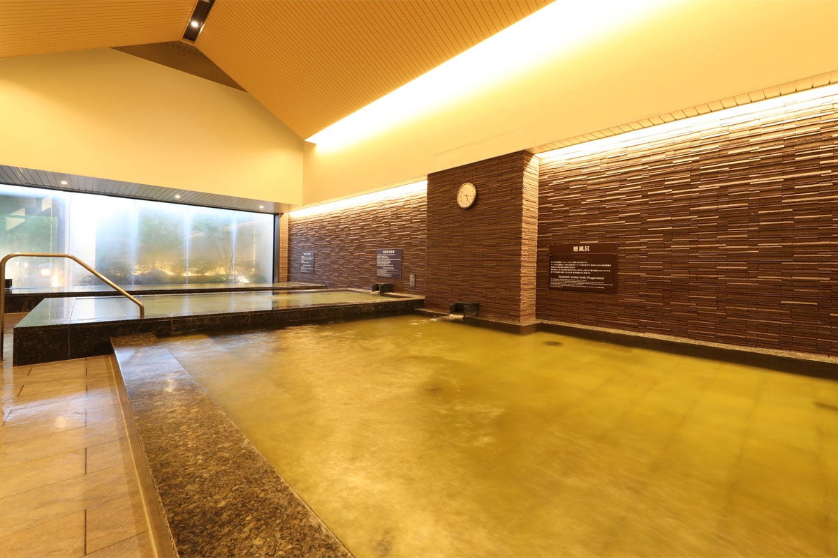 同館の地下1,150mから湧き出た自家源泉は、炭酸水素ナトリウム(重曹)と塩化ナトリウム(食塩)を多く含み、古い角質を取り去る美肌効果が期待できるうえ、保温効果がよく湯冷めしにくいことが特徴で、「美肌の湯」「温まりの湯」と言われています。自慢の天然温泉で、お母様とご一緒に癒やしのひとときをお過ごしください。