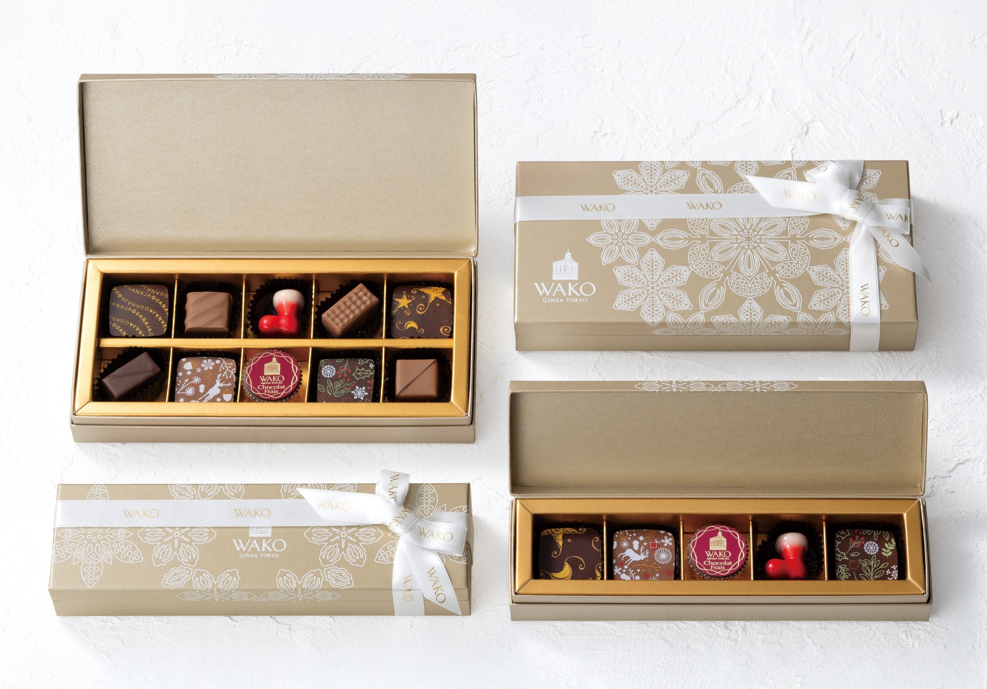 チョコレート専門の自家アトリエで一粒ひと粒手作りし、30年以上変わらぬ味わいを守り続けている和光のショコラ・フレ。クリスマスシーズン限定で店頭に並ぶ特別なボックスです。華やかな柄で彩られたシャンパンゴールドの箱の中には、クリスマス感たっぷりのチョコレート。プレゼントとしてもひときわ目を引くことでしょう。