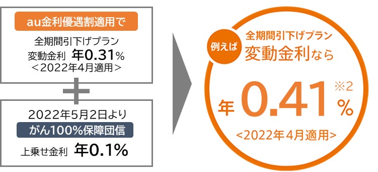 「au金利優遇割」※1が適用されると、最大年0.1%金利引下げとなり、「がん100%保障団信」をご選択の場合は、実質上乗せ金利なしとなります。