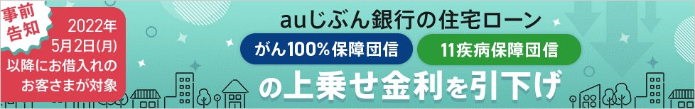 auじぶん銀行株式会社(本社:東京都中央区、代表取締役社長:臼井 朋貴、以下 auじぶん銀行)は、2022年5月2日から住宅ローンをお借入れのお客さまを対象に、団体信用生命保険(以下 団信)の「がん100%保障団信」と「11疾病保障団信」の上乗せ金利を引下げします。