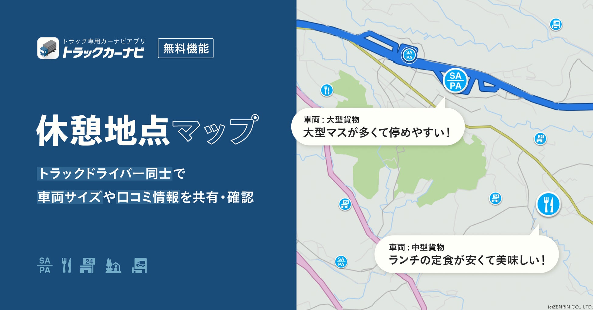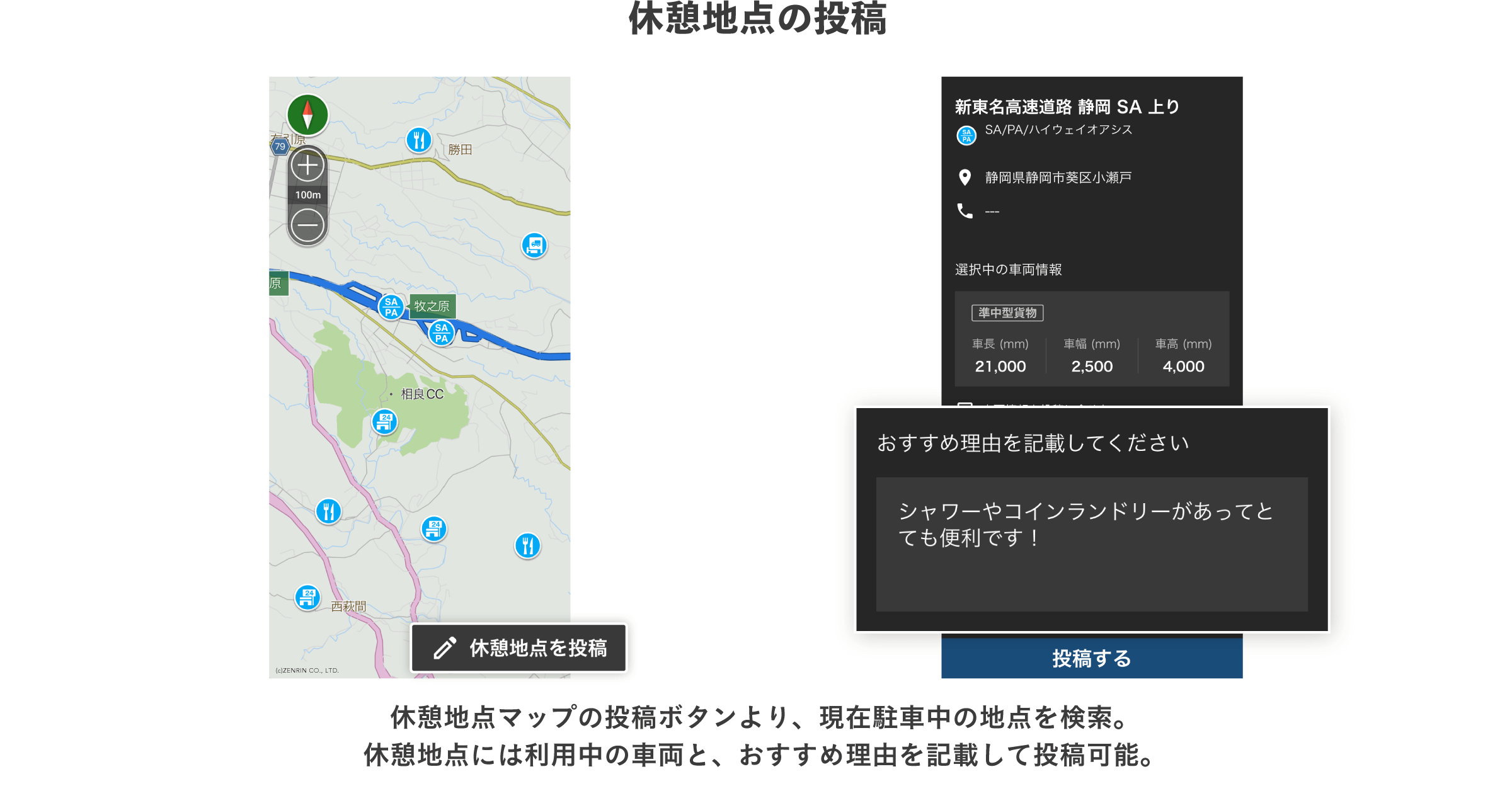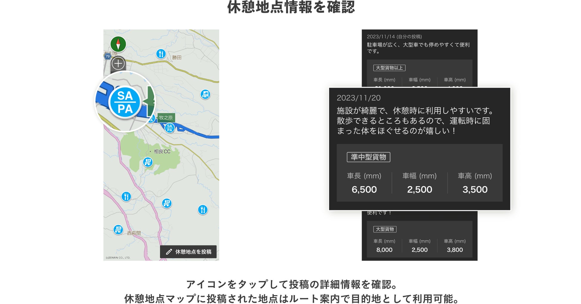 ~ユーザー同士の口コミ情報と車両サイズを確認できる休憩地点検索専用マップで、スムーズに休憩を~