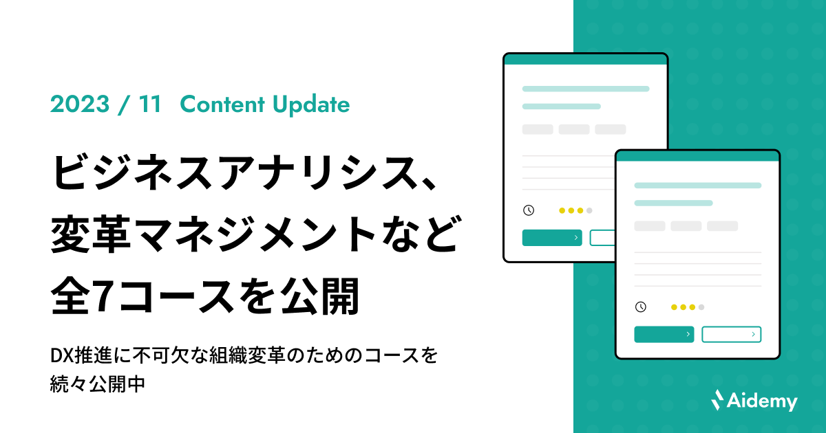 2023年11月は、組織変革にフォーカスした「ビジネスアナリシス概論:エンタープライズ変革に求められる力」「変革マネジメント 〜ミドルアップで“壁”を越える〜」や、リテラシー醸成の契機として定評のある10分でキャッチアップシリーズなど、計7コースをリリースいたしました。