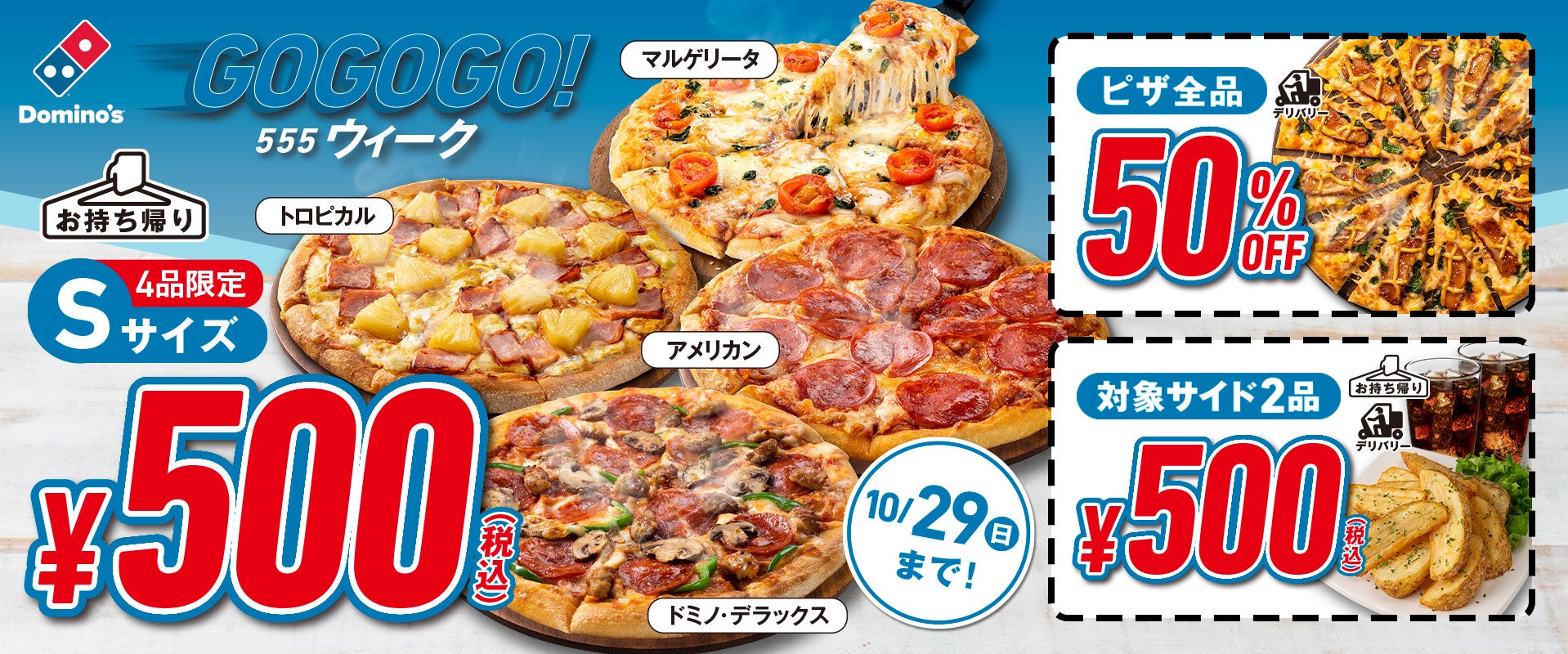 本キャンペーンでは、引き続き、人気の「アメリカン」、「マルゲリータ」、「トロピカル」のSサイズがお持ち帰り限定でワンコイン(50(ゴー)0円)になるほか、デリバリー限定でピザ全品50(ゴー)%OFFに。さらに、お好きなサイドメニュー2品もワンコイン(50(ゴー)0円)でご提供します。「ドミノ・デラックス」が対象に加わって、お持ち帰りSサイズ500円のチョイスが4種になるのは初!もっとドミノを、もっとおトクに!もっと美味しく!残り3日間、10月29日(日)まで、「GoGoGo!ウィーク」をお楽しみください。ドミノ・ピザにGo!Go!Go!