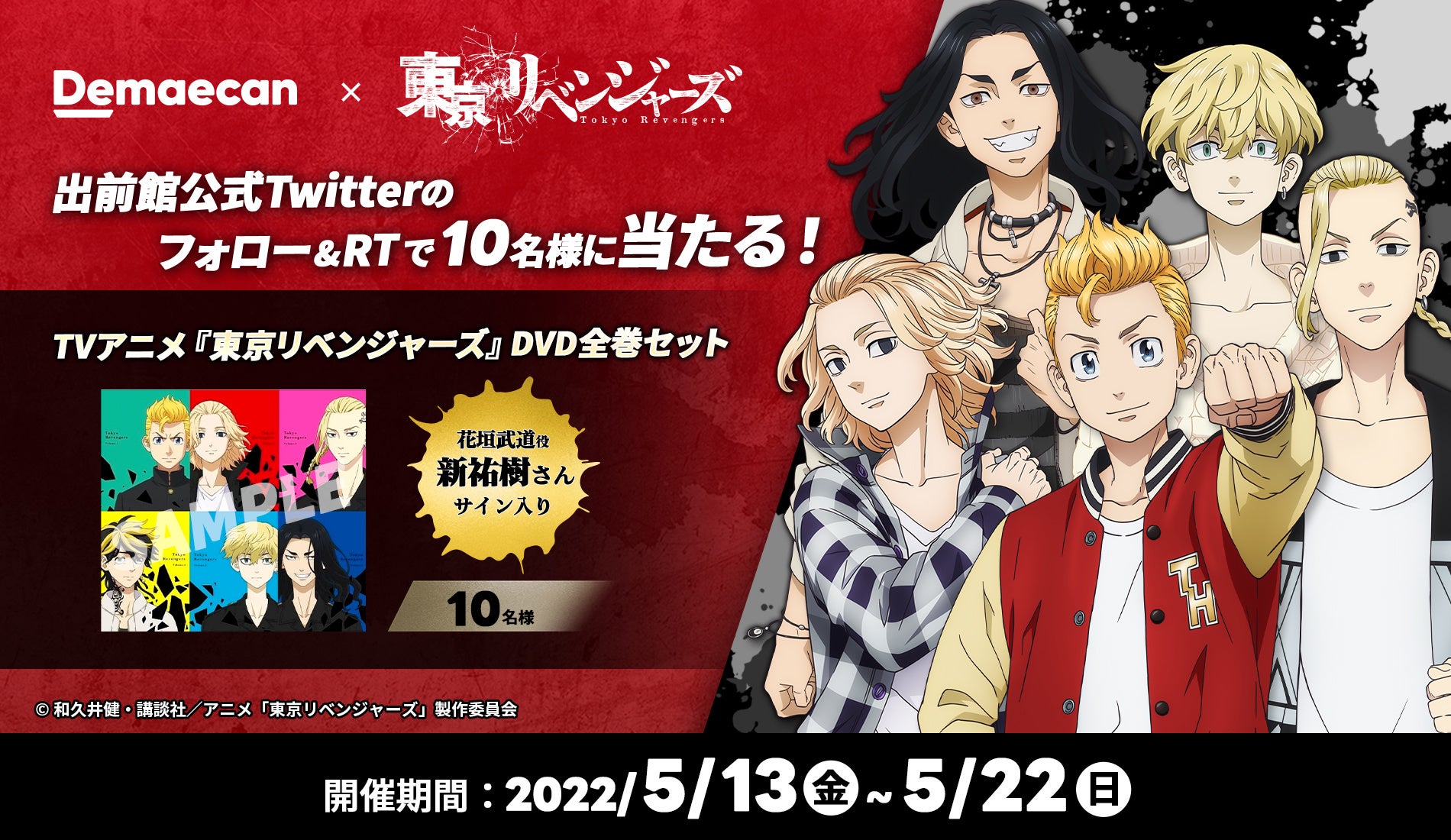 『出前館』公式 Twitter のフォロー&RT で当たる!TVアニメ『東京リベンジャーズ』DVD全巻セット(花垣武道役 新祐樹さんサイン入り)をプレゼント!