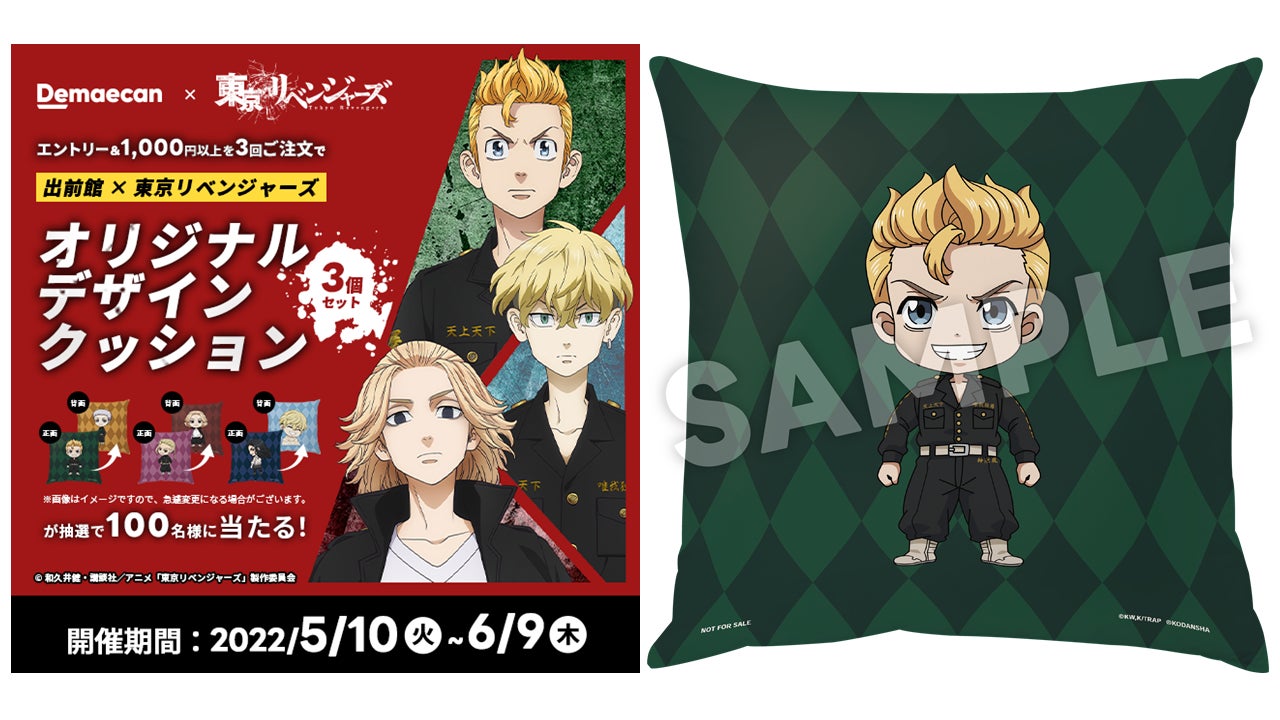 このたび『出前館』は、TVアニメ「東京リベンジャーズ」とのコラボキャンペーンを2022年5月10日(火)より開催します。本キャンペーンにご参加いただいた方の中から抽選で、「オリジナルデザインクッション3個セット」をプレゼントいたします。また、『出前館』の公式Twitterにて、フォロー&RTキャンペーンを2022年5月13日(金)より開催し、同時に『出前館』をお得にご利用いただけるコラボクーポンも配布いたします。さらに、「東京リベンジャーズ」とコラボしたLINEスタンプを2022年5月10日(火)より無料配信いたします。『出前館』LINE公式アカウントを友だち追加するとダウンロードいただけます。