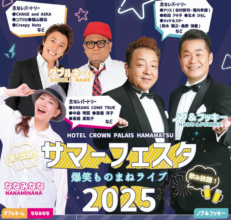 ホテルマネージメントインターナショナル株式会社(略称:HMIホテルグループ、本社:東京都中央区日本橋)が運営する、ホテルクラウンパレス浜松(静岡県浜松市)では、サマーフェスタ 爆笑ものまねライブ2025を開催いたします。
