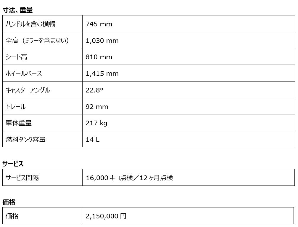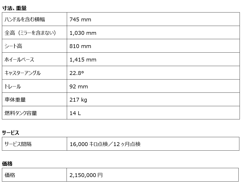 ※仕様については、欧州仕様表記のため日本仕様とは異なる場合があります。なお、記載の仕様は予告なしに変更される場合があります。日本のHPに掲載の各車の重量は日本の届け出重量となり、乾燥重量とは異なる場合があります。
