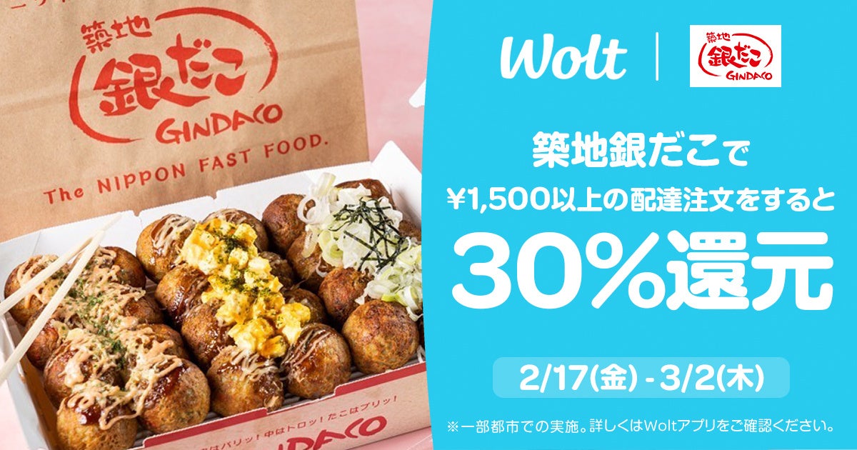 この度、「築地銀だこ」 ・ 「銀だこ酒場」 などで 「Wolt」 の加盟・サービス導入が100店舗を超えたことを記念し、2月17日(金)~3月2日(木)までの14日間、Woltアプリ内から1,500円以上の配達注文で 『30%分のWolt割引クレジット還元!キャンペーン』 を実施いたします。※詳細はキャンペーン概要をご確認ください