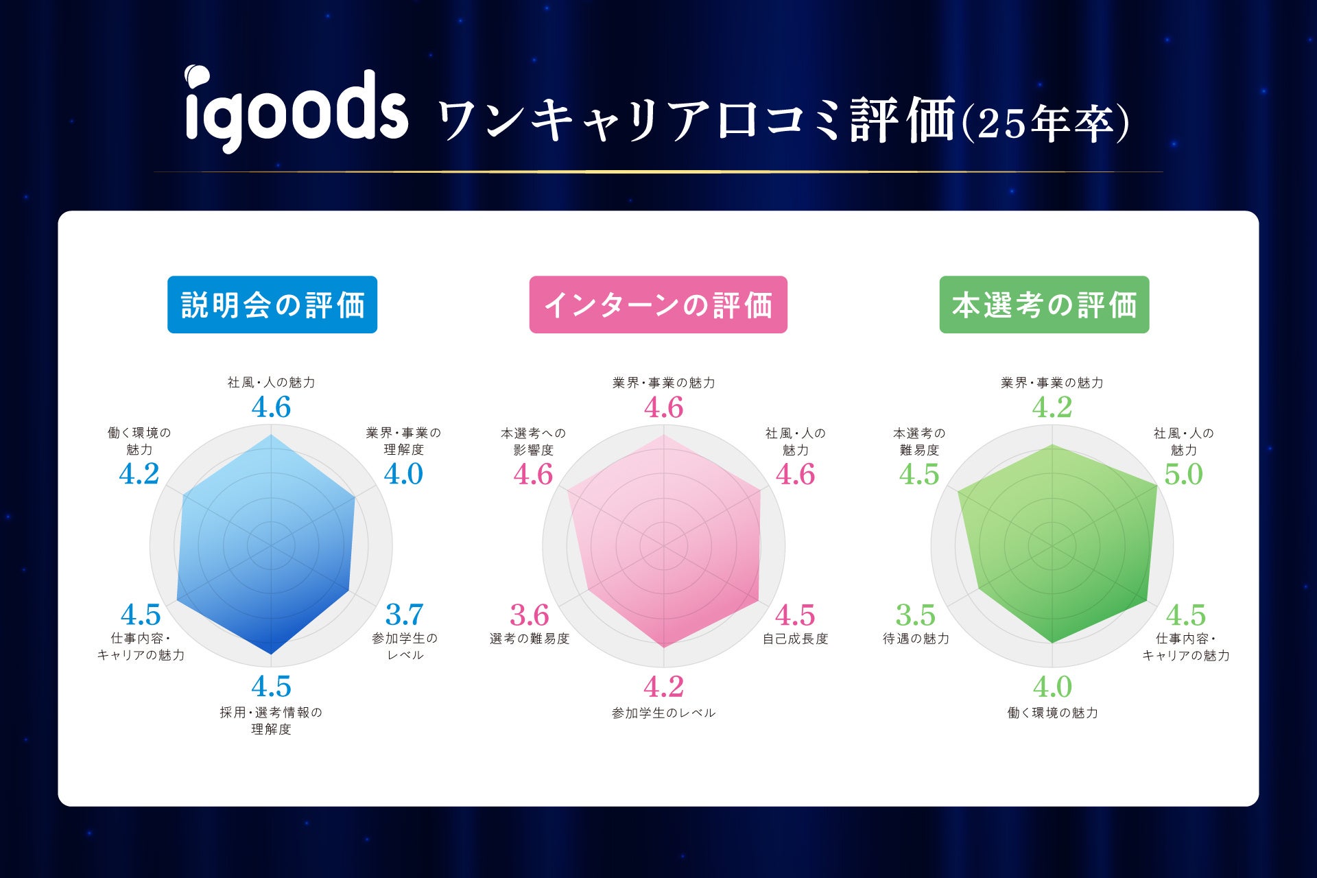 実際のクチコミでも、「メイン事業のフルオーダーグッズ営業体験ワークのレベルが高く、業務内容はもちろん、やりがいや困難まで体感できた」「フィードバックをくれる社員が、実際の上司のような関わりをしてくれたため、人に本気な社風が伝わった」などの声がみられ、アイグッズの業務・社風をリアルに知れる点で学生から評価をいただいています。