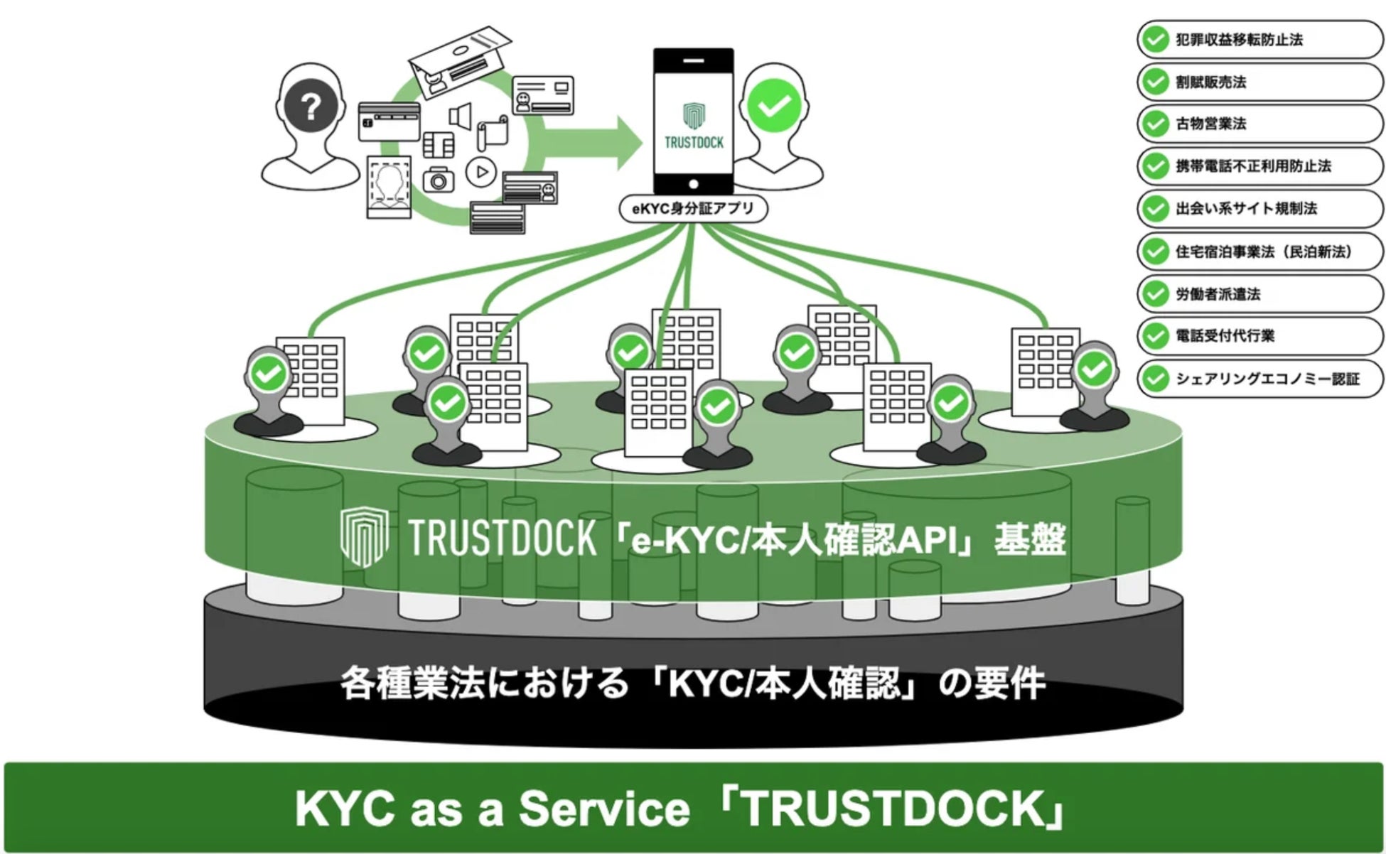 KYC as a Service「TRUSTDOCK」が提供している、デジタルIDウォレットとeKYC本人確認APIサービスでは、犯罪収益移転防止法をはじめ、携帯電話不正利用防止法、古物営業法、労働者派遣法、出会い系サイト規制法、民泊新法など、各種法律に準拠したKYCをAPI組み込みのみで実現します。