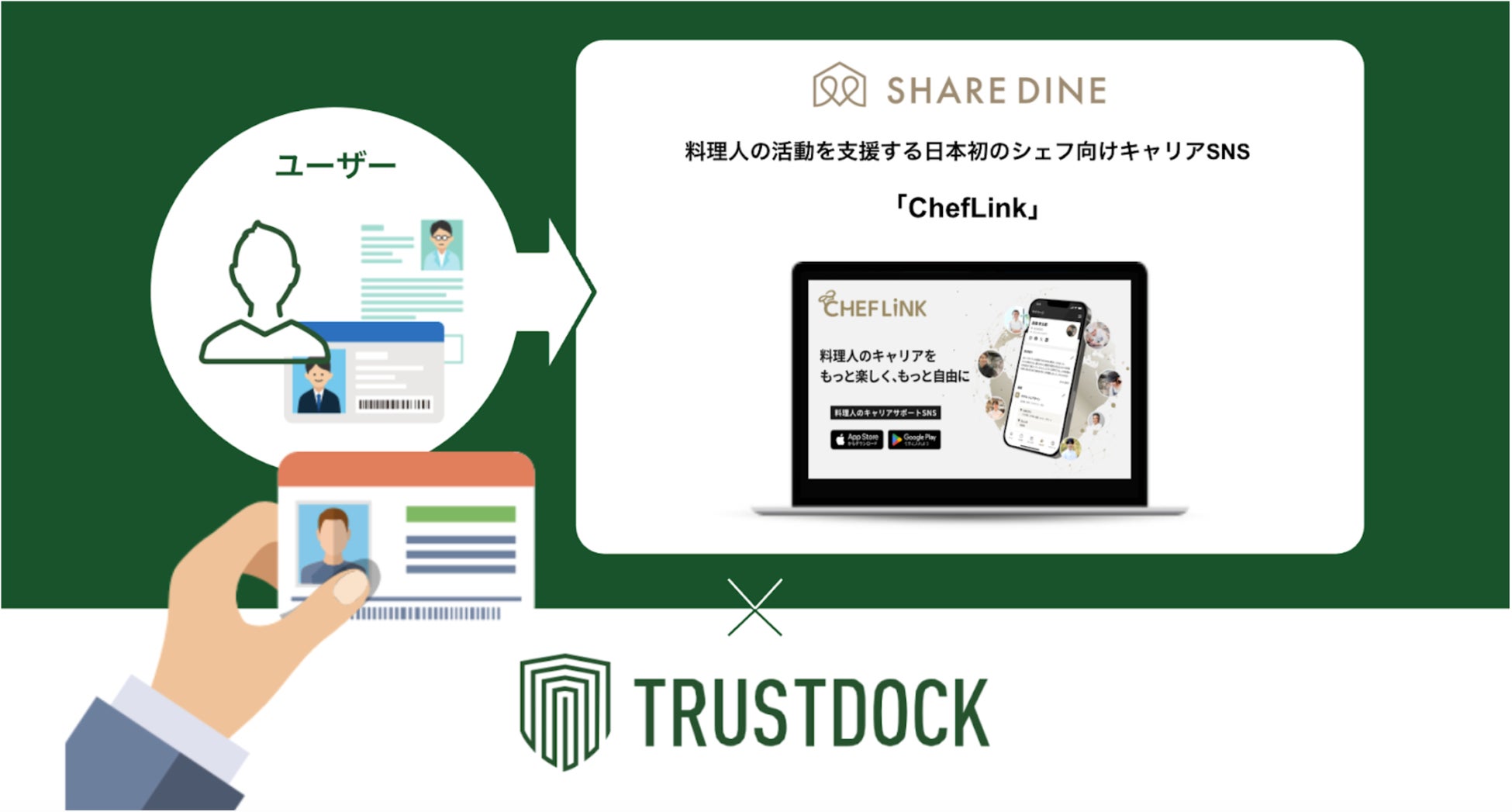 デジタル本人確認の株式会社TRUSTDOCKは、株式会社シェアダインが展開する料理人専用キャリアサポートSNS「CHEFLINK(シェフリンク)」に、eKYC本人確認「TRUSTDOCK」を提供。