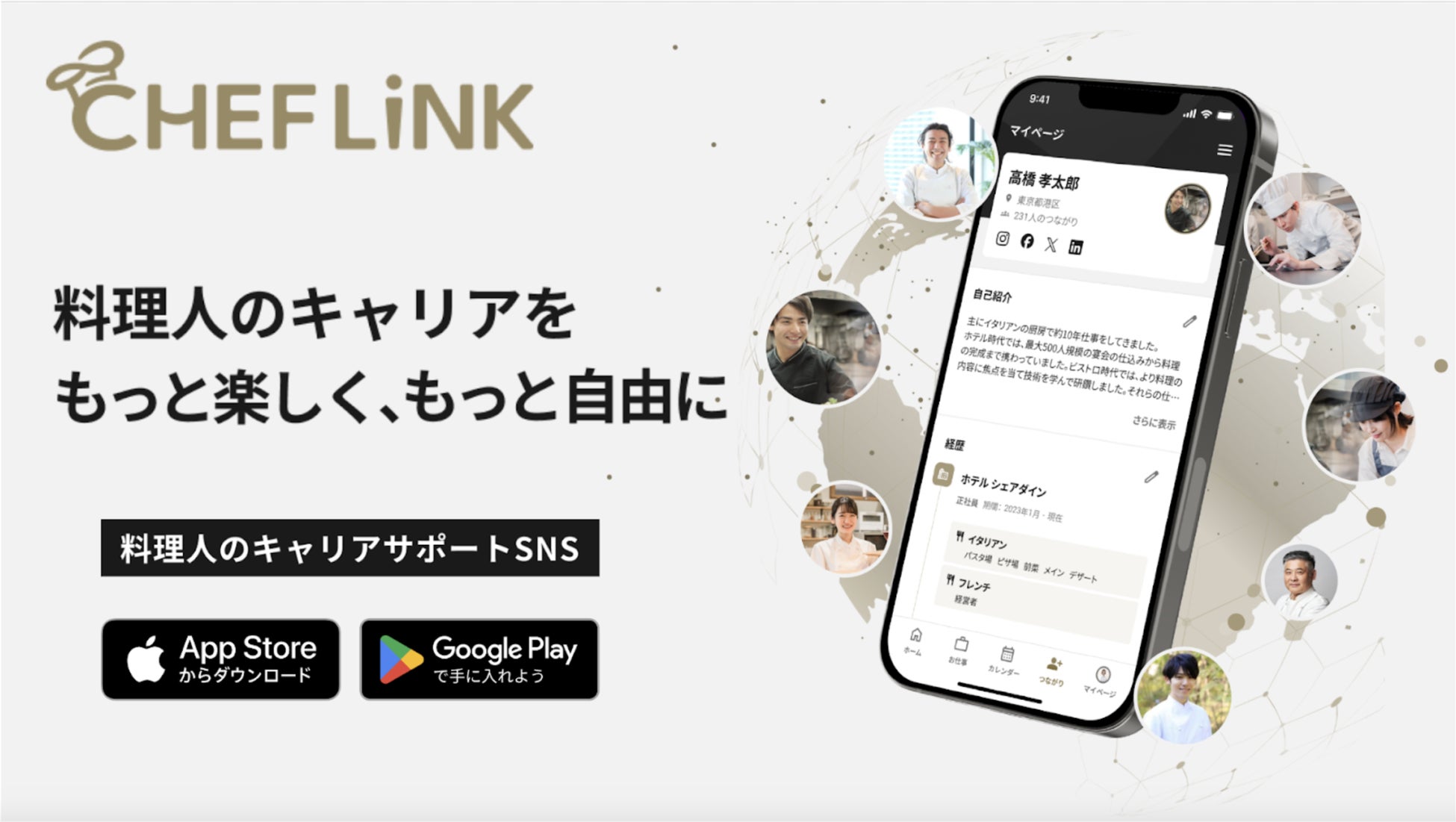 「CHEFLINK(シェフリンク)」は、料理人の活動を支援する料理人専用キャリアサポートSNSです。自身の経歴を登録しスポットシェフの求人情報を得ることができるほか、仕事管理・カレンダー管理・報酬管理機能を搭載し、他の料理人と繋がることで他者のキャリア形成を参考にすることが可能です。料理人同士が当該アプリ上で社会的な関係性を構築・維持し、コミュニケーションの活性化により、ビジネスチャンスを広げ自身のキャリアの幅を広げる機会を創出します。