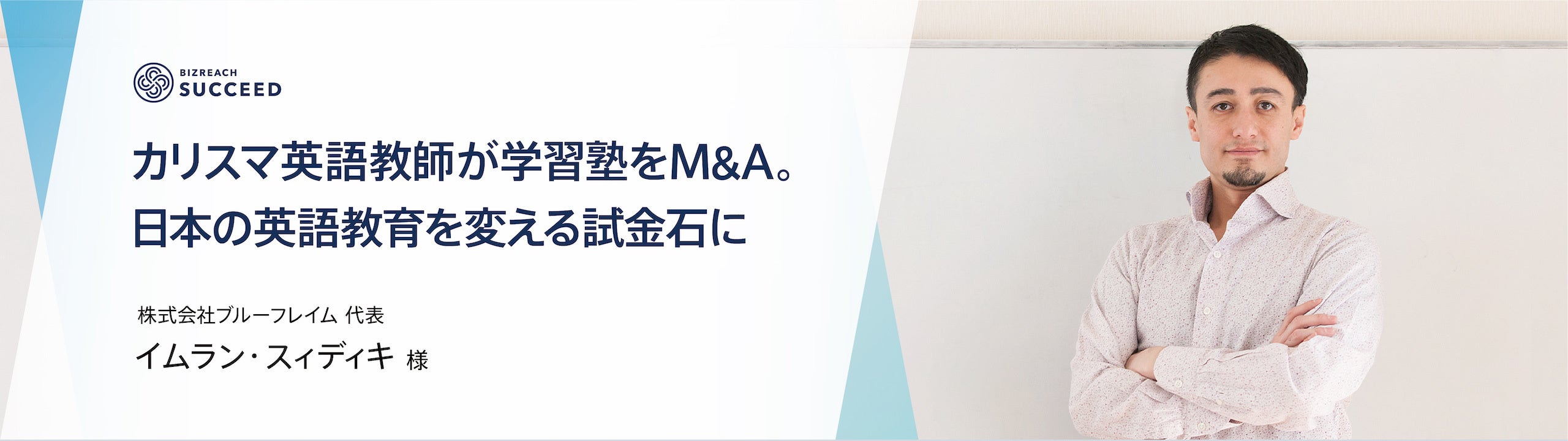 Visionalグループの株式会社M&Aサクシード(所在地:東京都渋谷区/代表取締役社長:金 蓮実)が運営する事業承継M&Aプラットフォーム「ビズリーチ・サクシード」(https://br-succeed.jp/)は、「ビズリーチ・サクシード」経由で、英会話学校を運営する株式会社ブルーフレイム(所在地:東京都港区、以下:ブルーフレイム)が、個別指導塾の事業を譲り受けたことをお知らせします。今回、ブルーフレイムが譲り受けたのは、小学生・中学生・高校生を対象とした「個別学習塾」で、出会いから三カ月で成約しました。ブルーフレイム代表のイムラン・スィディキ氏はYouTubeチャンネル登録者数が13万人以上、開発した英語アプリ50万ダウンロード、英語関連書籍出版20冊超など、多くの支持を受ける英語教師です。今回の事業譲受により、ブルーフレイムは、イムラン氏が中心となり培ってきた英語教育メソッドを学習塾という新たな教育の場で展開します。
