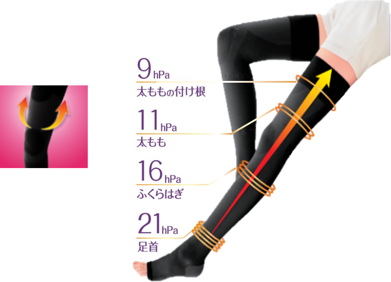 (足首21hPa、ふくらはぎ16hPa、太もも11hPa、太もも付け根9hPa )